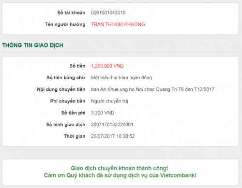 Một người bạn an_khue tên Bo ủng hộ thường xuyên Nồi cháo Quảng Trị 200N/tháng từ 2016, nhờ an_khue chuyen giup 6 tháng/lần. Hôm nay em chuyển tiền T6-T12/2017 và cả bill chuyển T1-T6/2017, Nhờ chị Thỏ cập nhật và xác nhận giúp em tiền đã đến đúng địa chỉ để em thông báo lại với bạn em. Trân trọng