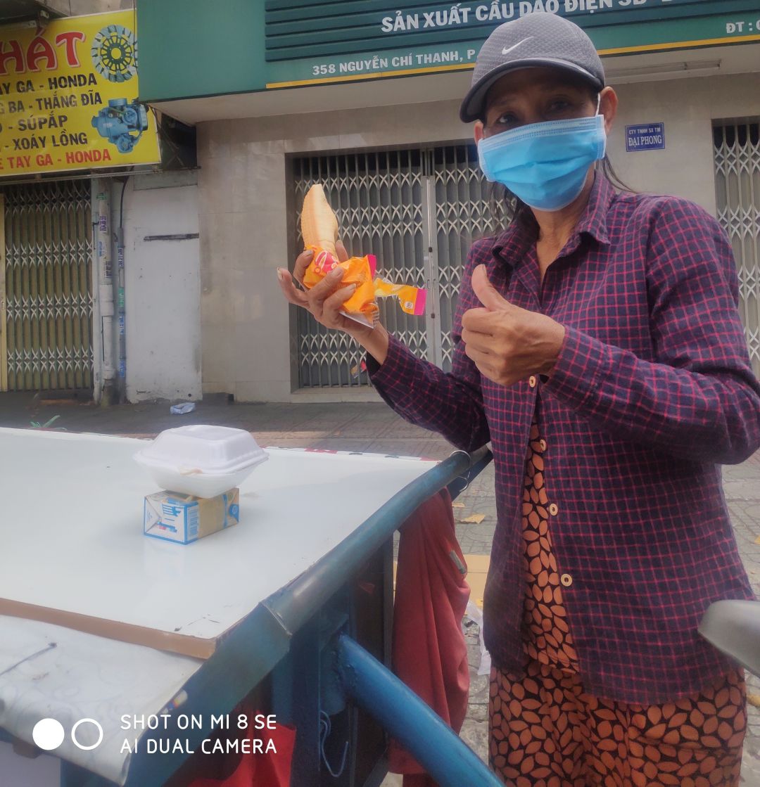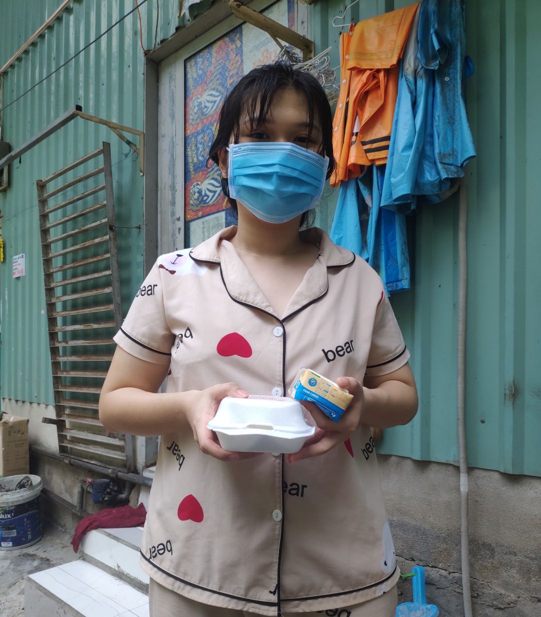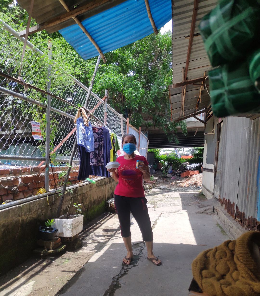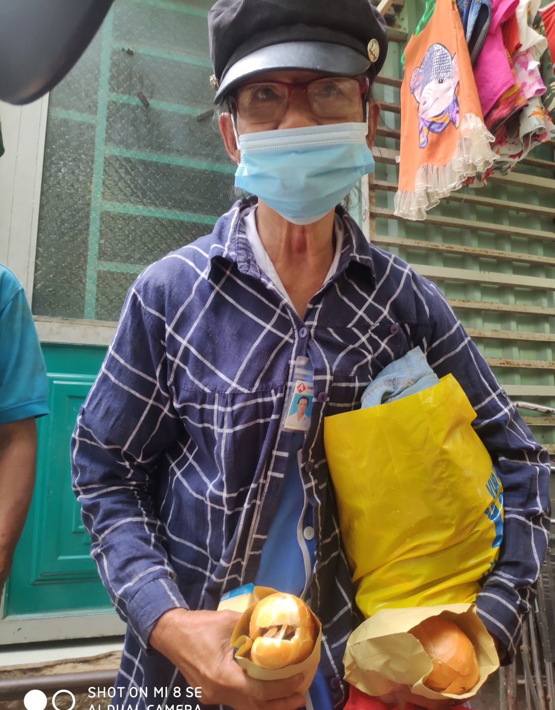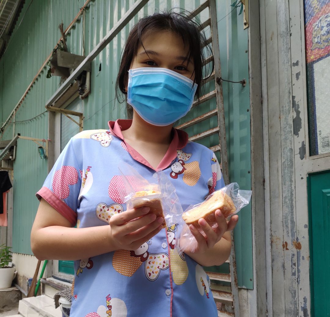 Hình ảnh Mai Trâm đi phát bánh mì+sữa đậu nành+khẩu trang y tế. tại xóm trọ nhiều người bán vé số,làm nghề ve chai nơi Mai Trâm cư trú.