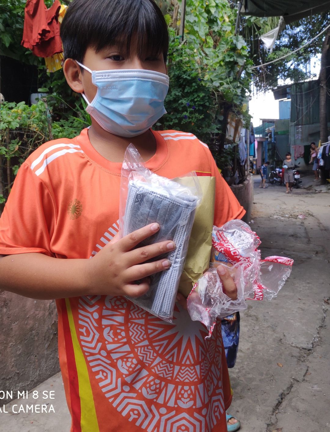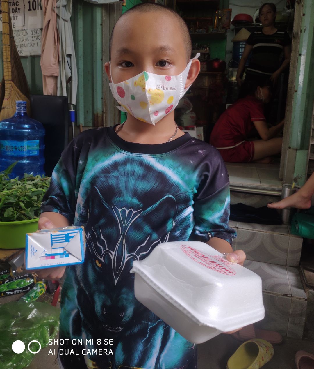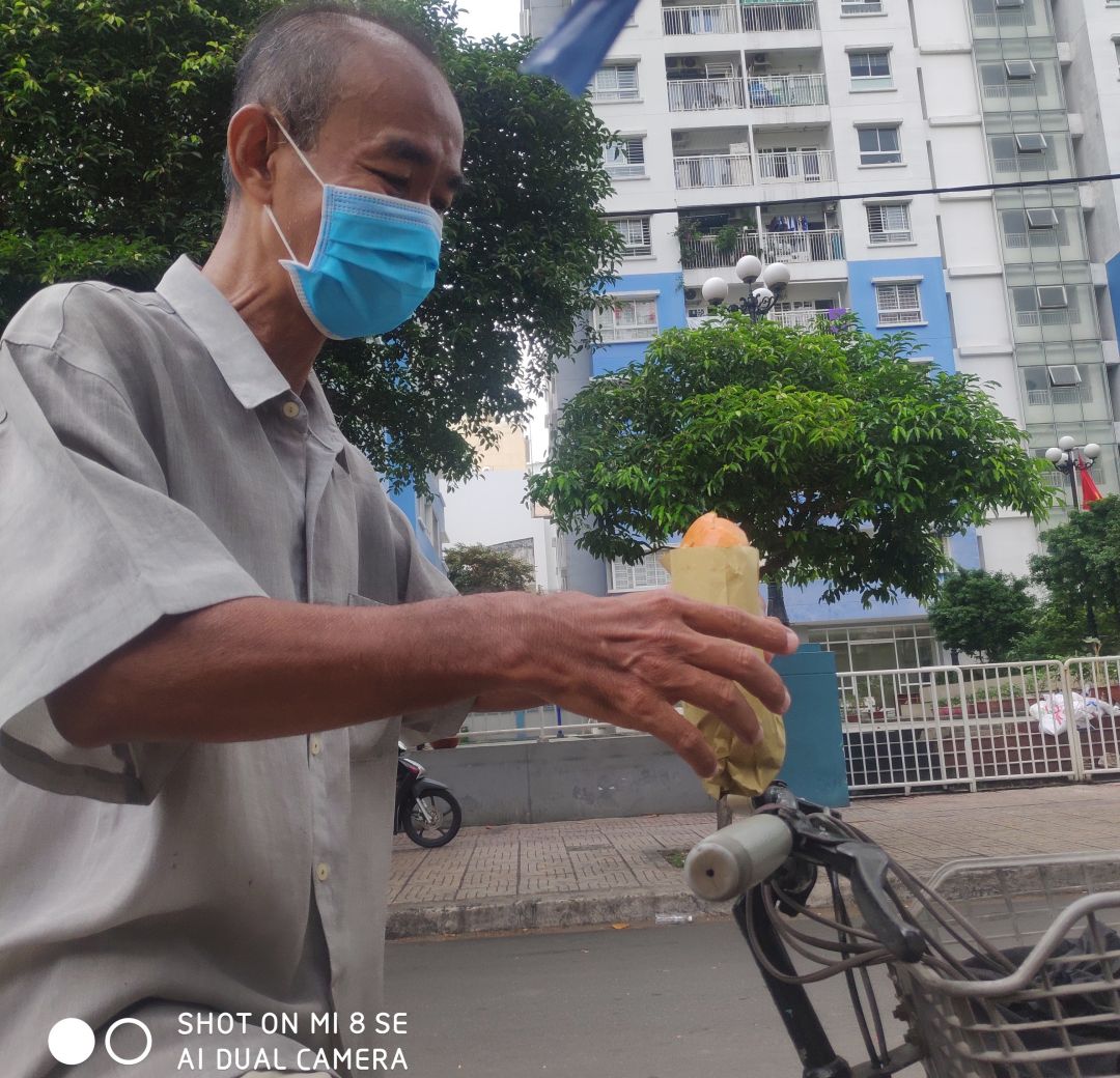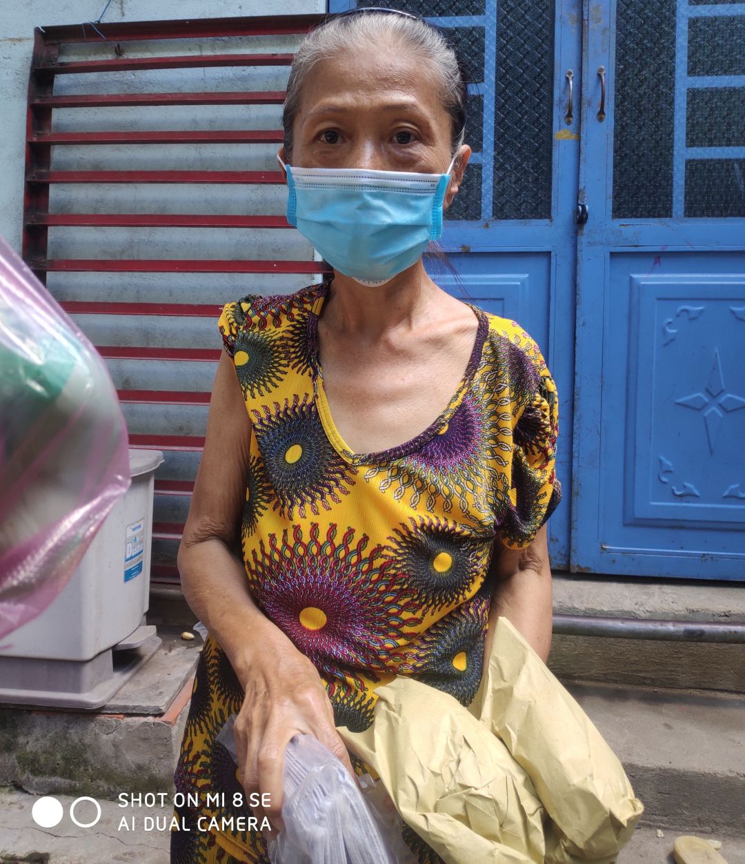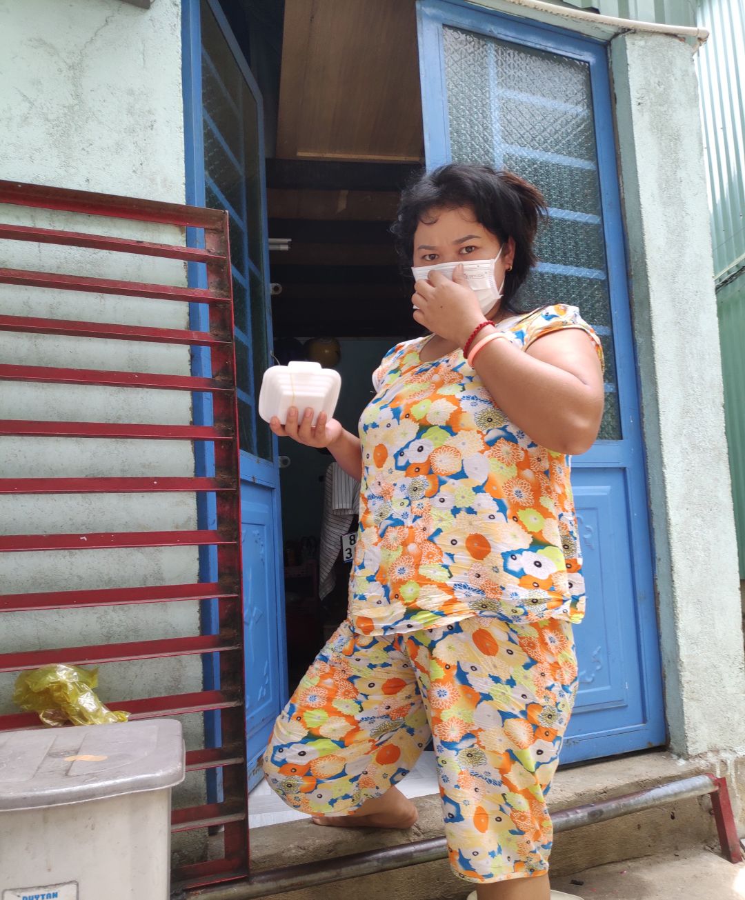 Hình ảnh Mai Trâm đi phát bánh mì+sữa đậu nành+khẩu trang y tế. tại xóm trọ nhiều người bán vé số,làm nghề ve chai nơi Mai Trâm cư trú.