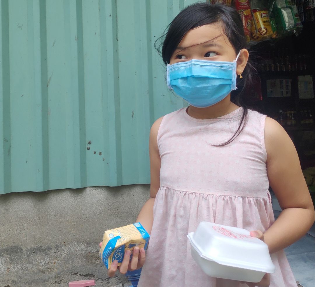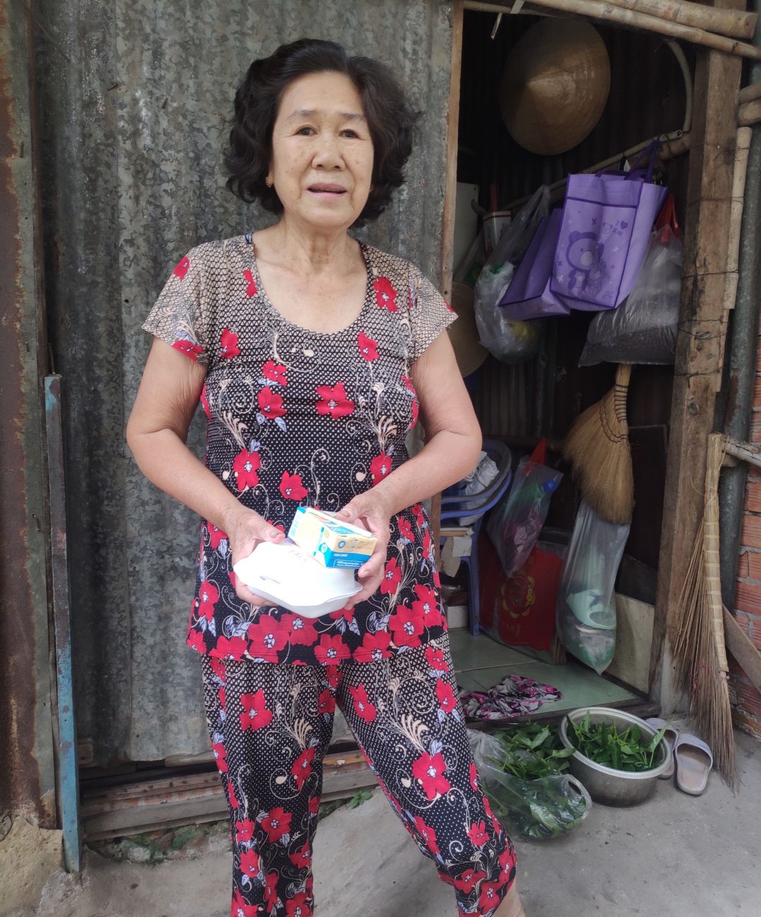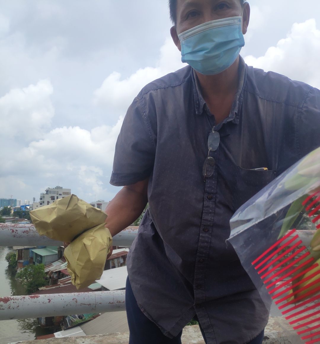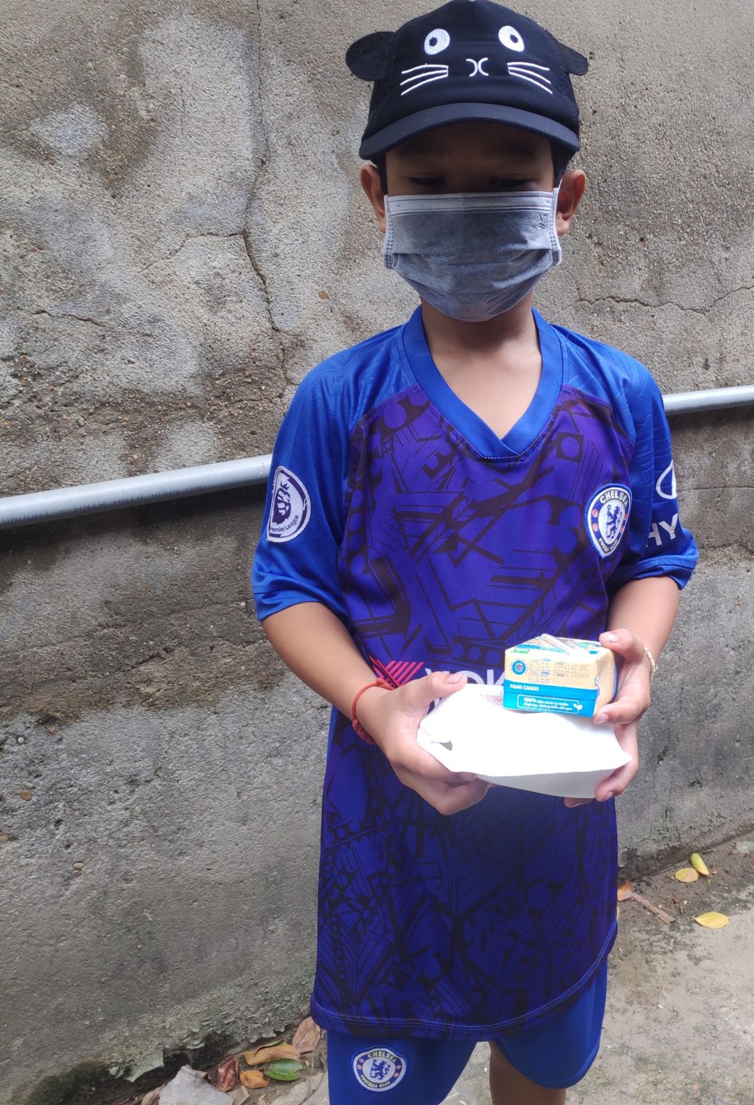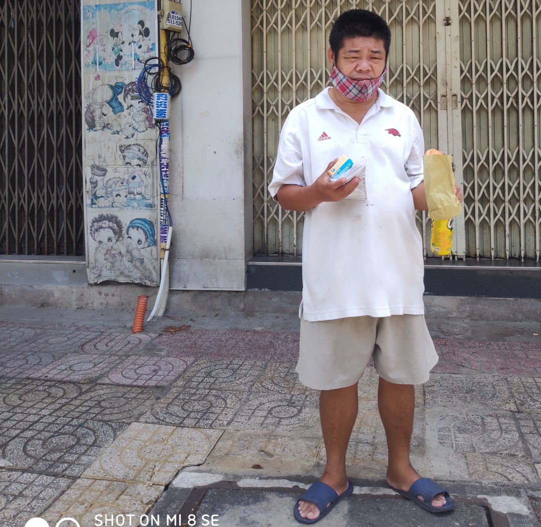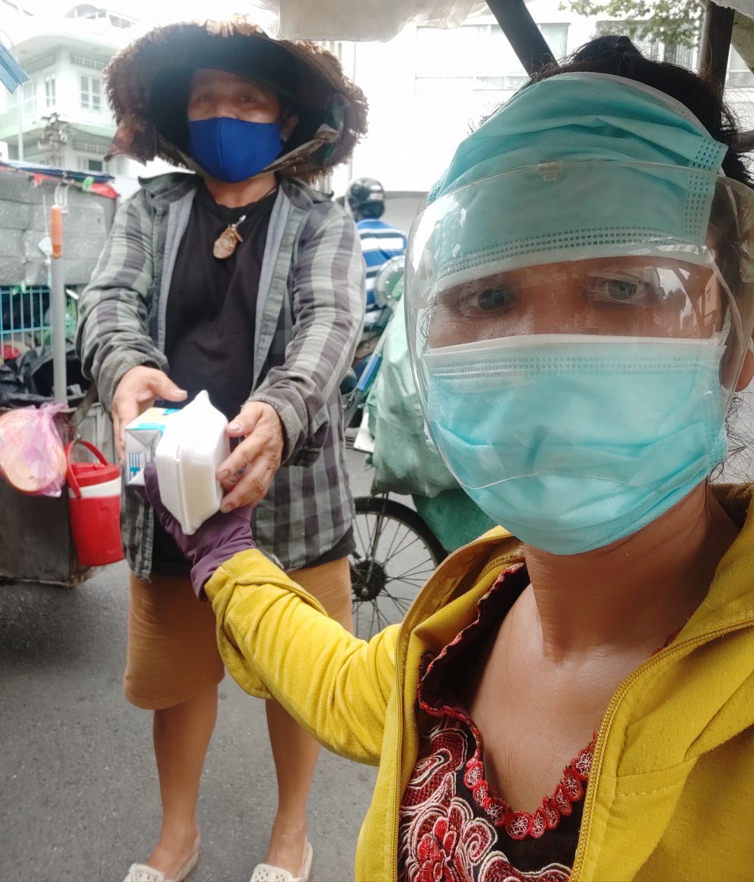 Hình ảnh Mai Trâm đi phát bánh mì+sữa đậu nành+khẩu trang y tế. tại xóm trọ nhiều người bán vé số,làm nghề ve chai nơi Mai Trâm cư trú.