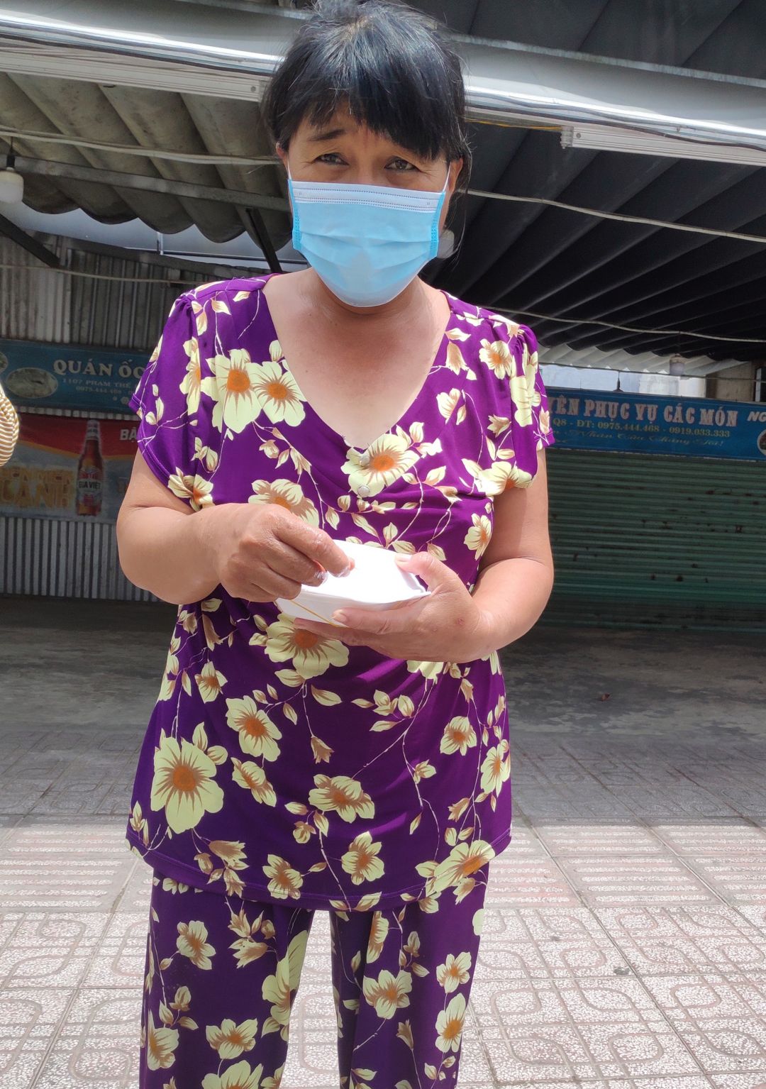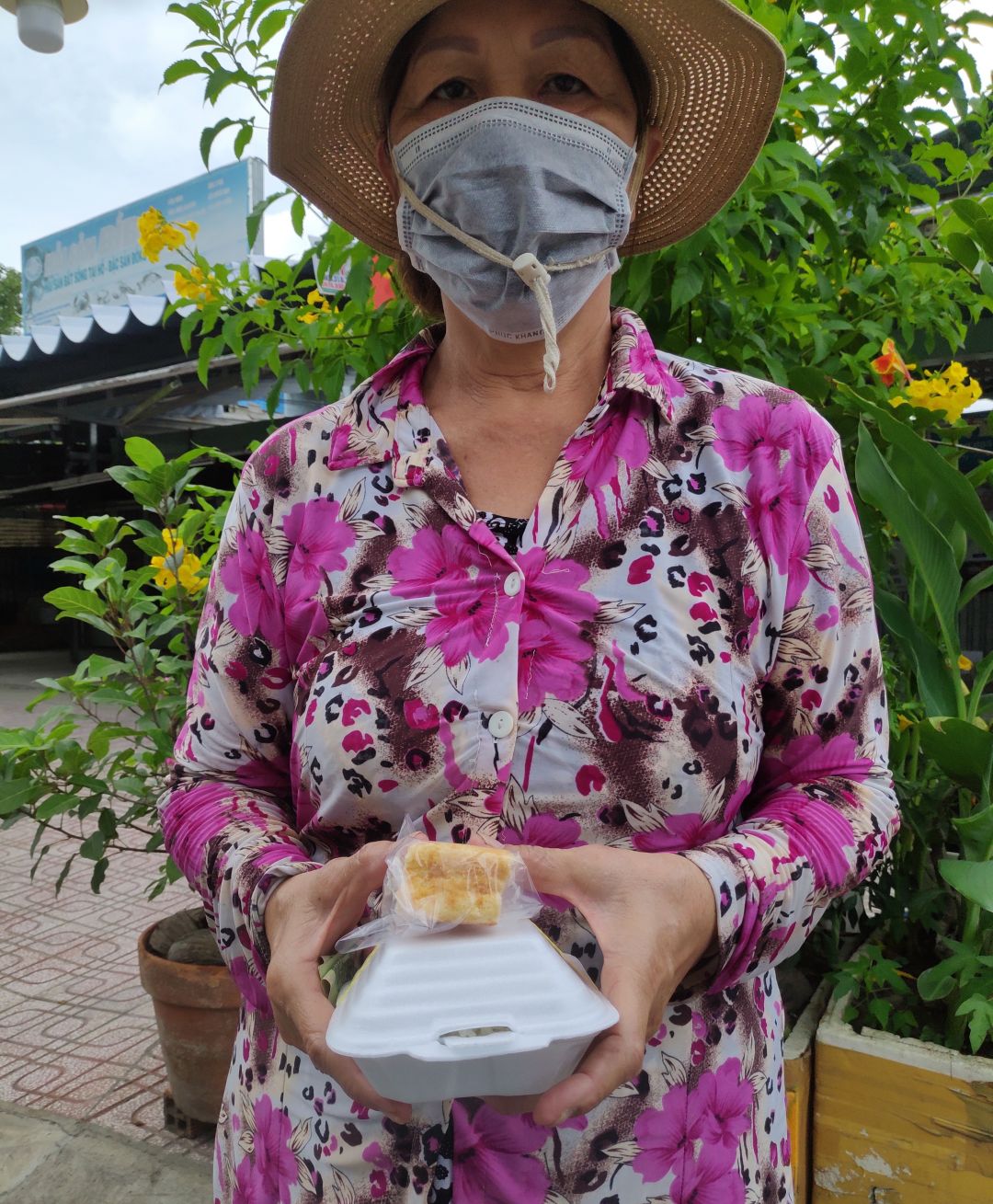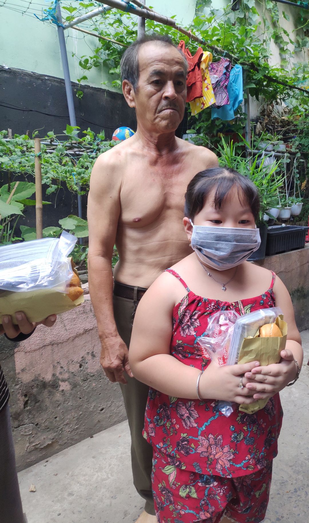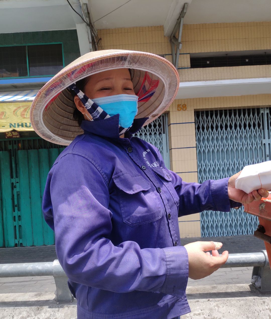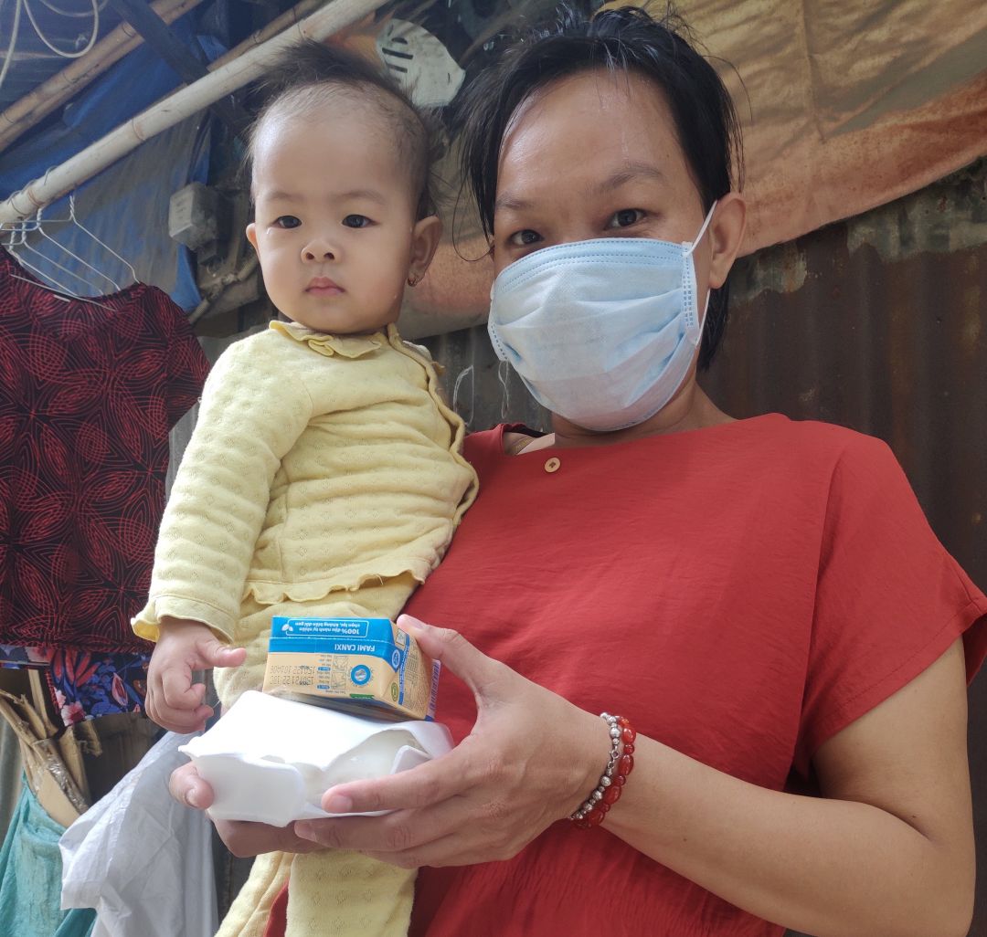 Hình ảnh Mai Trâm đi phát bánh mì+sữa đậu nành+khẩu trang y tế. tại xóm trọ nhiều người bán vé số,làm nghề ve chai nơi Mai Trâm cư trú.