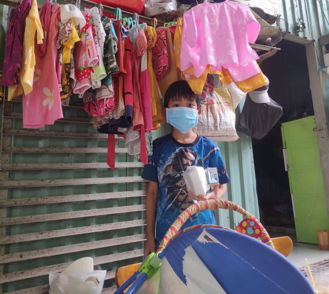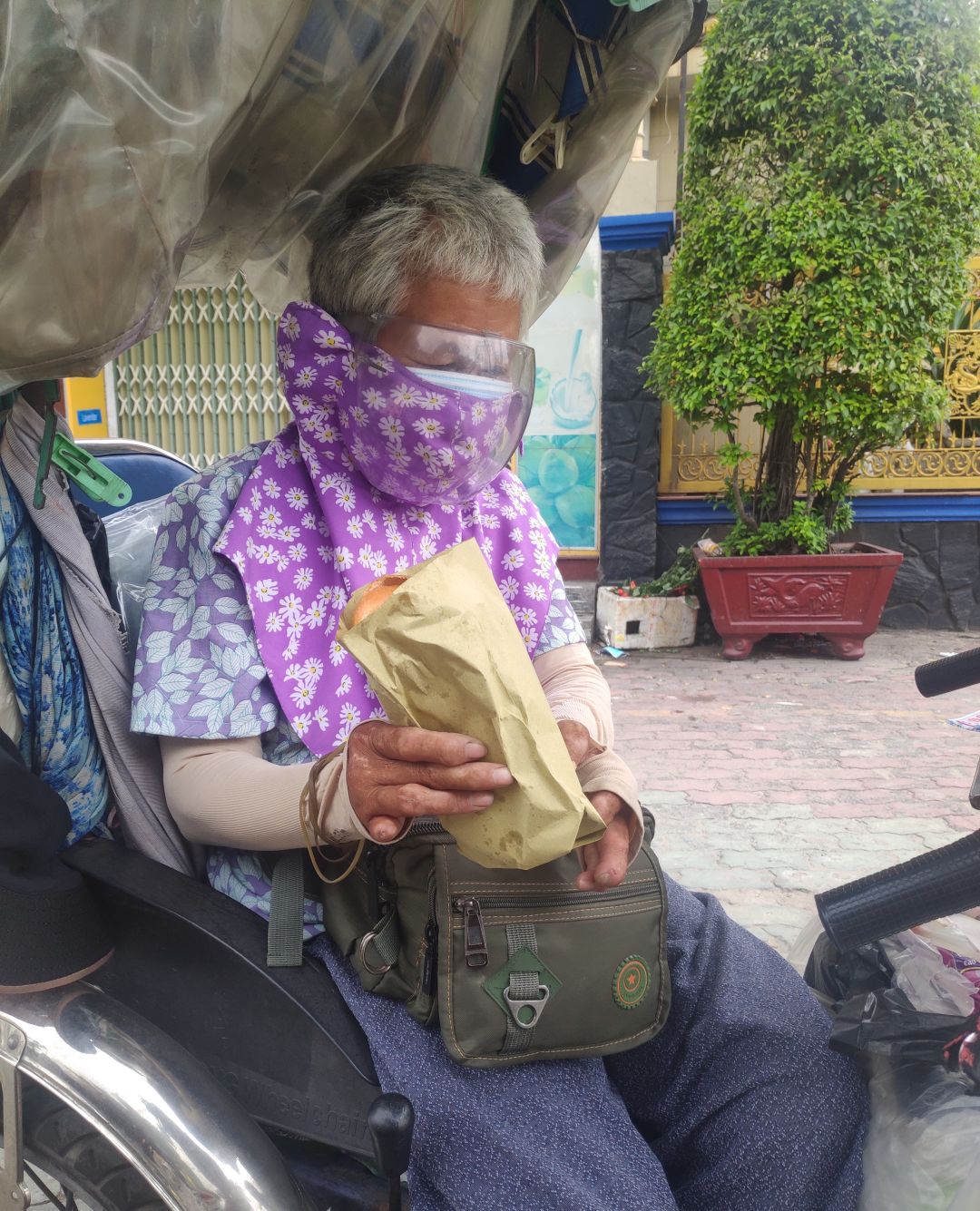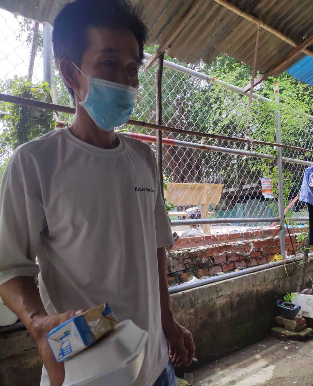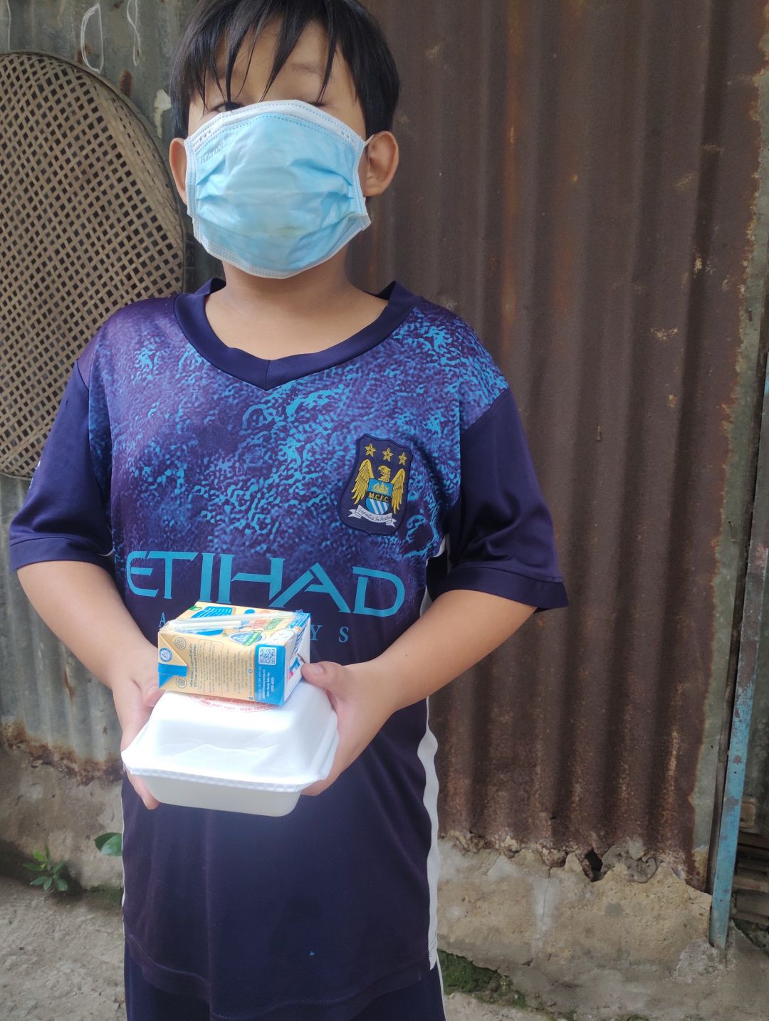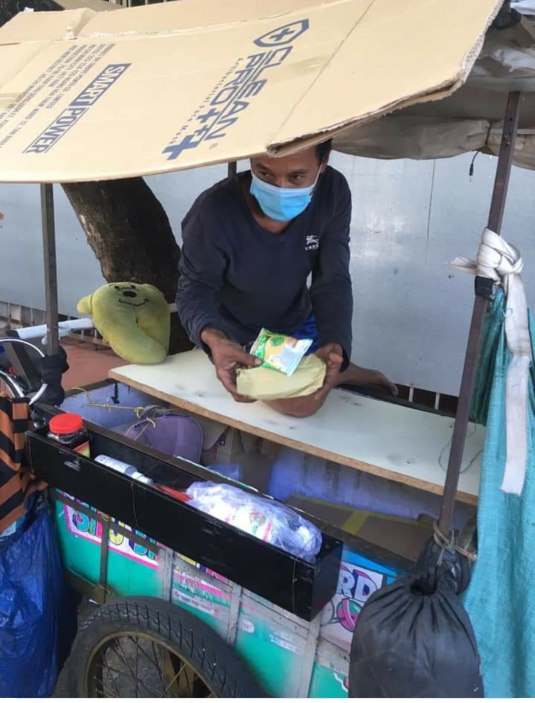Hình ảnh Mai Trâm đi phát bánh mì+sữa đậu nành+khẩu trang y tế. tại xóm trọ nhiều người bán vé số,làm nghề ve chai nơi Mai Trâm cư trú.