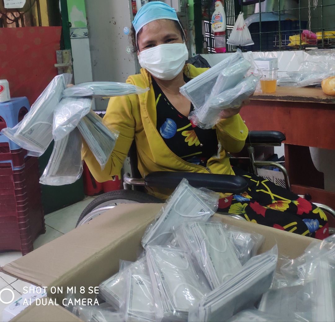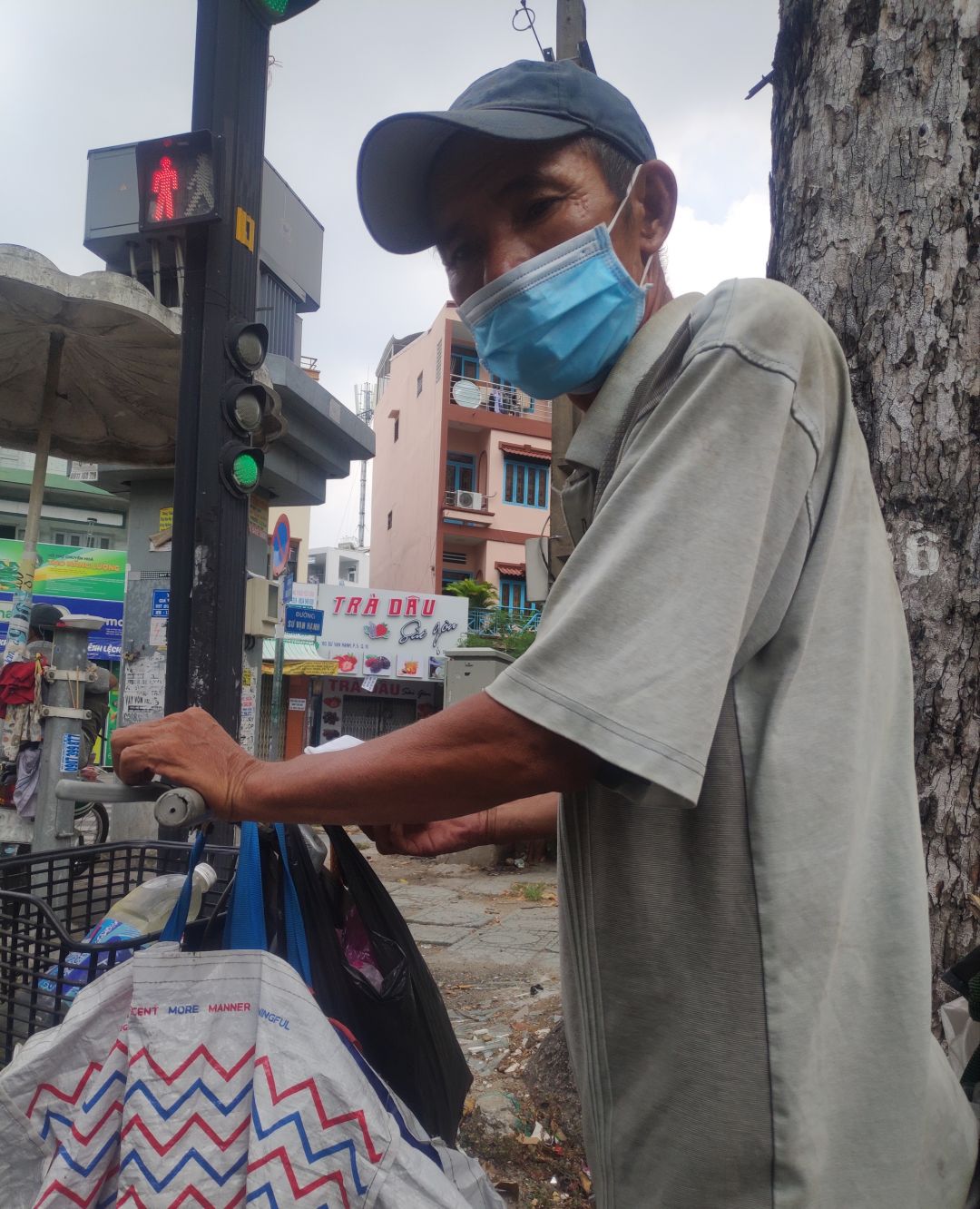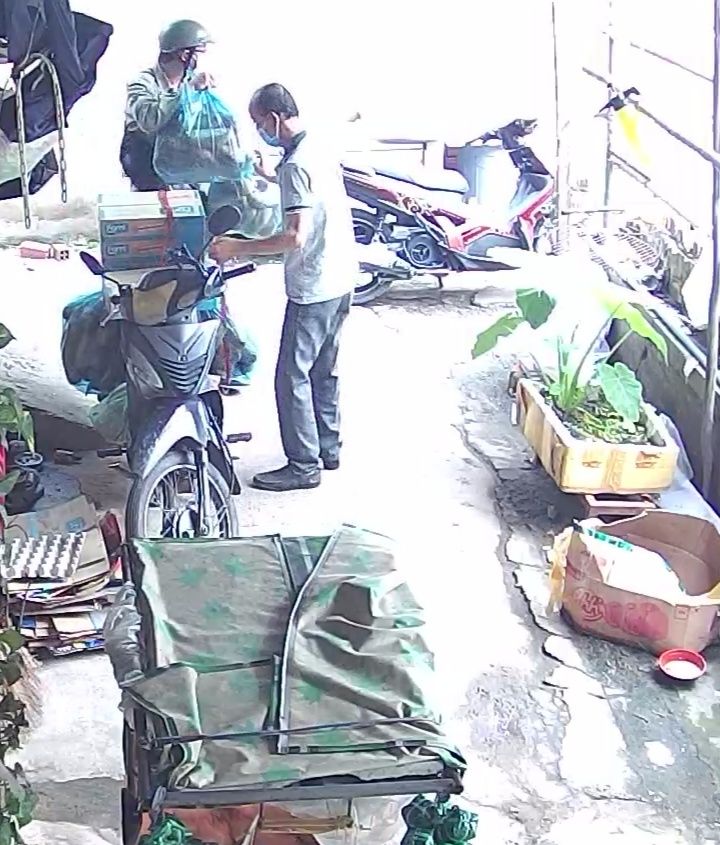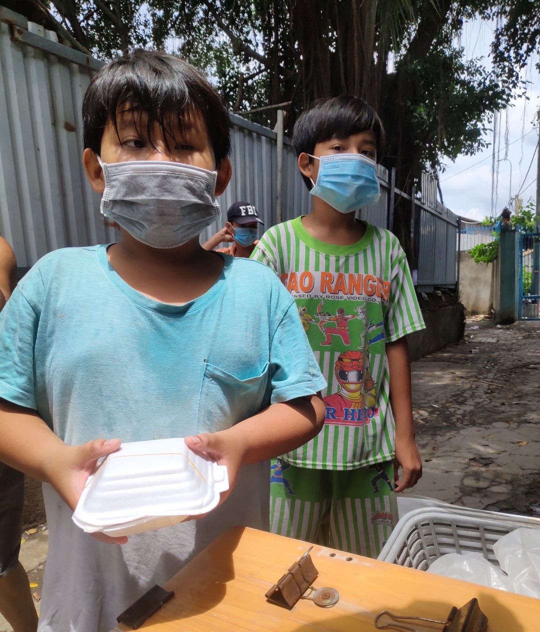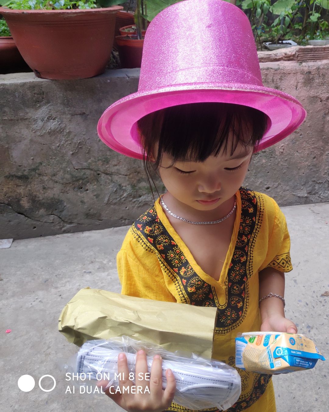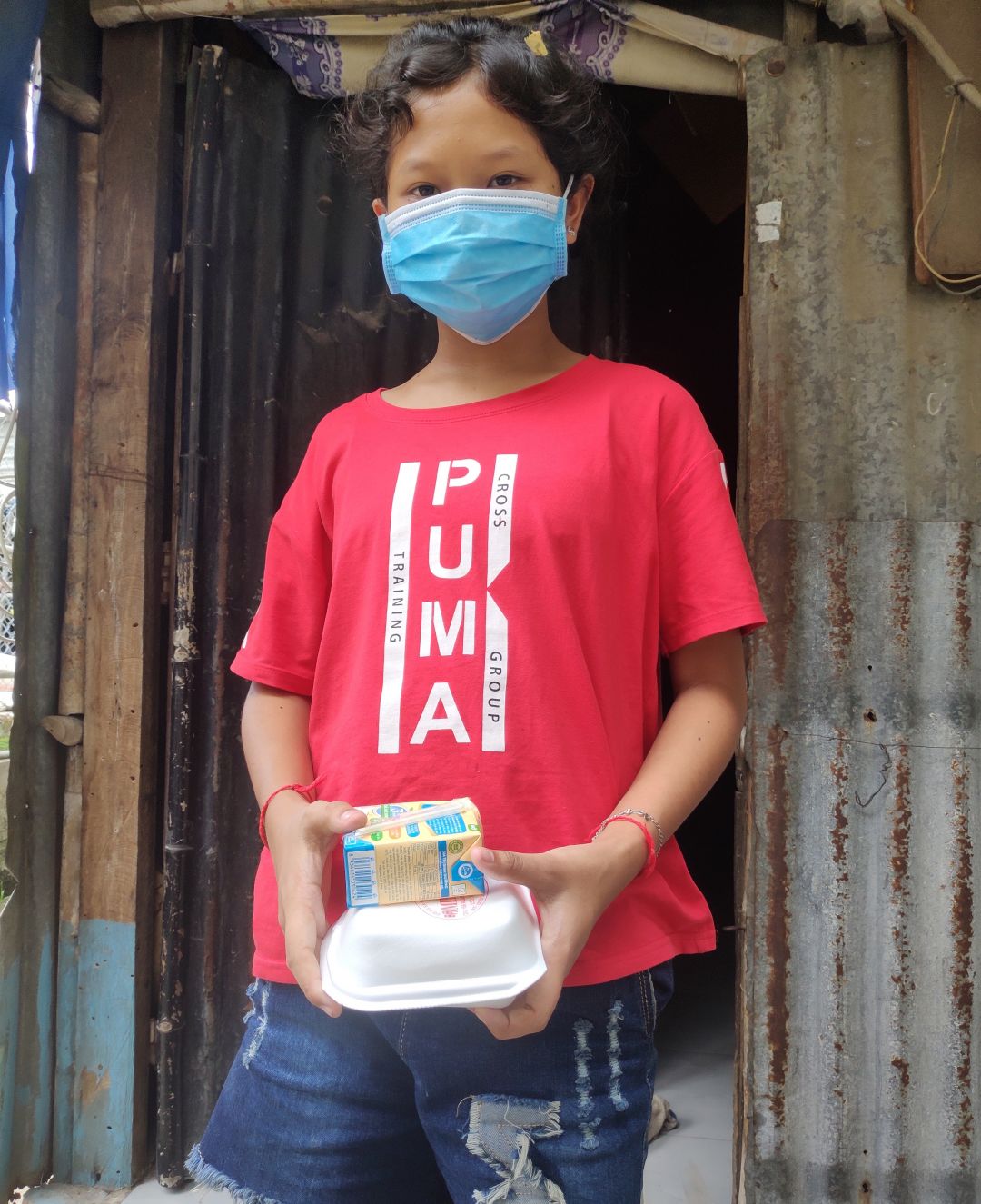 Hình ảnh Mai Trâm đi phát bánh mì+sữa đậu nành+khẩu trang y tế. tại xóm trọ nhiều người bán vé số,làm nghề ve chai nơi Mai Trâm cư trú.