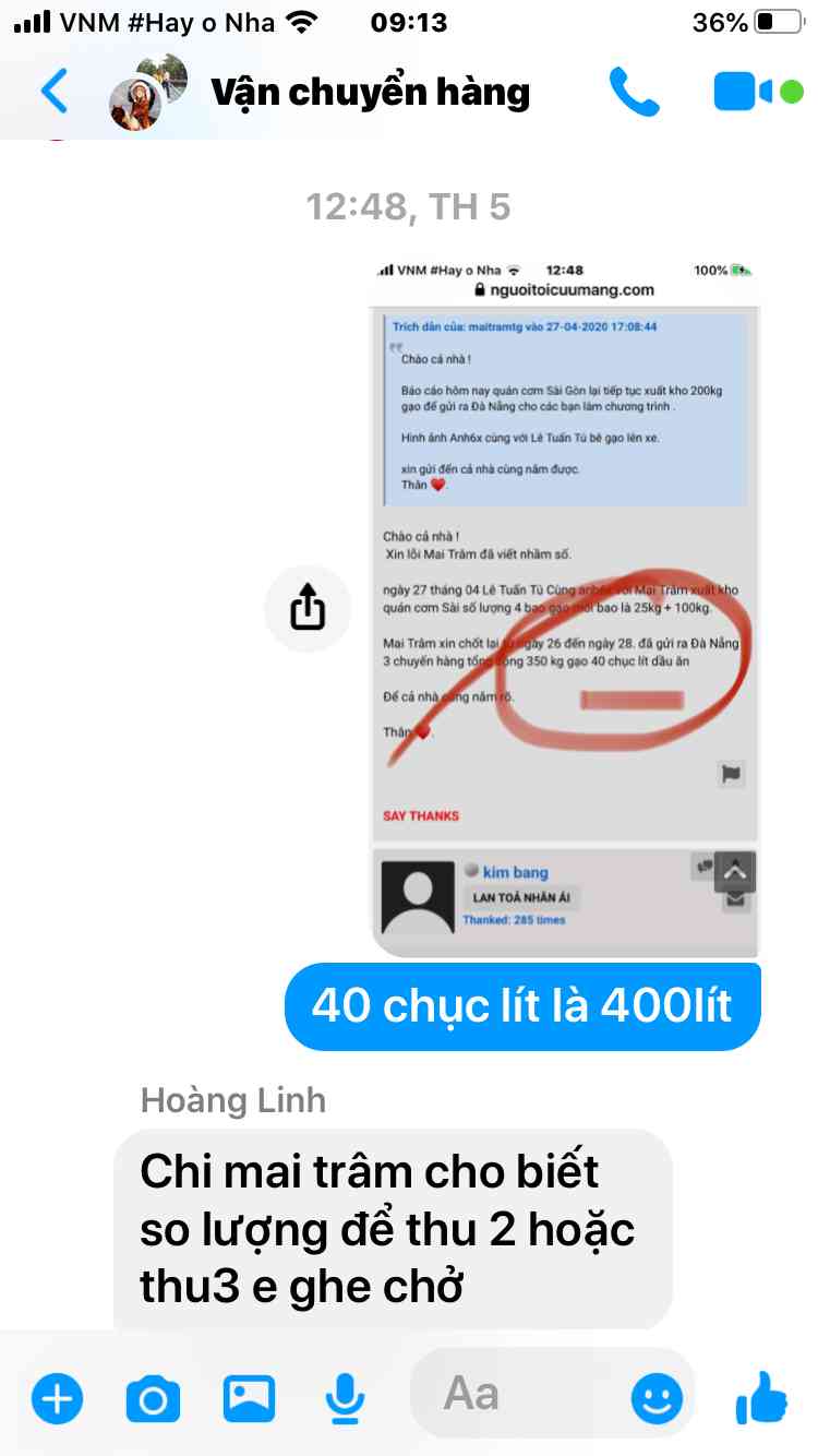 Mai Trâm xin chốt lại từ ngày 26 đến ngày 28. đã gửi ra Đà Nẵng 3 chuyến hàng tổng cộng 350 kg gạo 40 chục lít dầu ăn