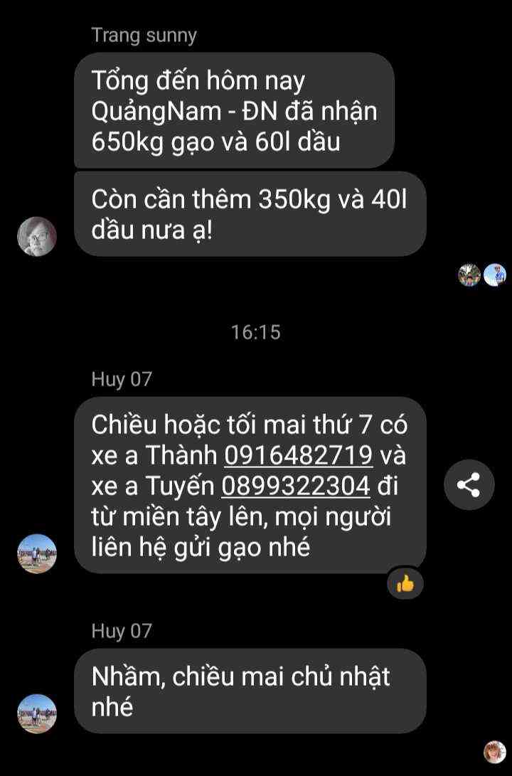 Lúc 20:31 .Mai Trâm có nhờ hai người một là con rể của chủ nhà trọ hai cháu ruột của chủ nhà trọ.để qua quán cơm xuất kho 200kg gạo và 40 lít dầu ăn. Để gửi ra Đà Nẵng cho các bạn làm chương trình.