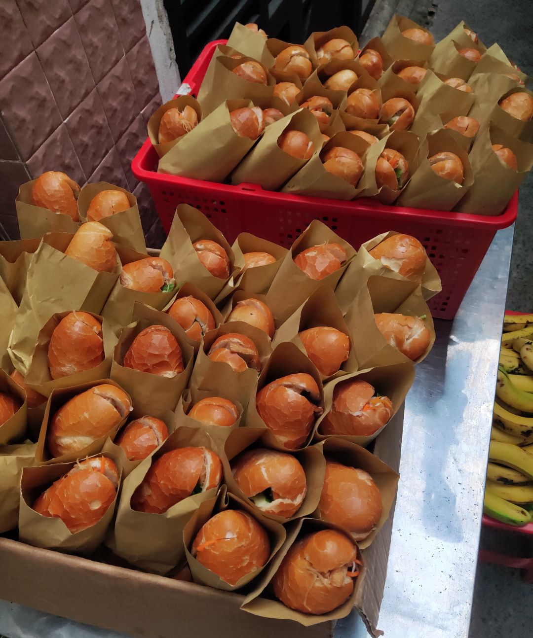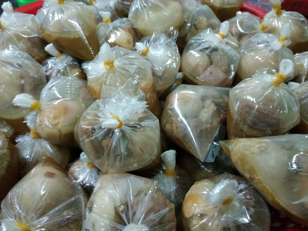 Hôm nay cô Tran Huong ủng hộ các nguyên liệu để làm 300 phần cơm thịt kho trứng cho bà con, kèm tráng miệng là chuối.