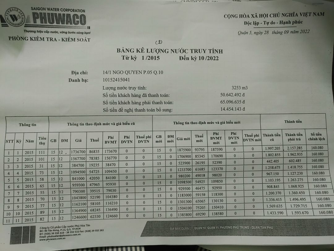 Lathuvang đã chi khoản truy thu tiền nước chênh lệch từ năm 2012 đến tháng9/2022 từ quỹ cơm 2000đ Saigon.