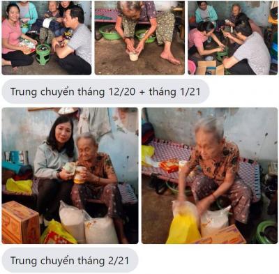 _ Ngày 3/2/21, Phụng nhờ nhóm ĐG trung chuyển 500k tháng 2 của Viethuong + 10kg gạo, 2 hũ nghệ viên mật ong cho cụ. Vì P đi thăm ngày 2/2/21 ko gặp cụ. Cụ đi chùa tu học. Nhóm ĐG cũng gửi biếu quà tết cho cụ.