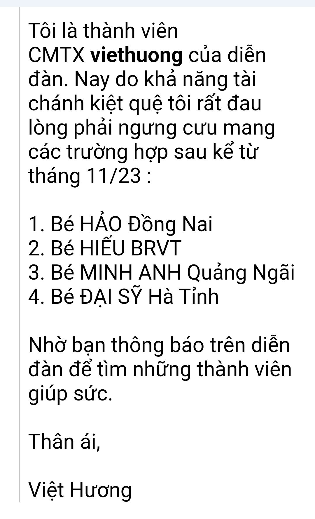 Theo như Mail mà Viethuong gửi thông báo tới ntcm2007@gmail.com thì vì kinh tế khó khăn nên bạn ấy buộc phải ngừng việc CMTX của cháu Minh Anh và 3 trường hợp khác sau đợt CMTX lần này.