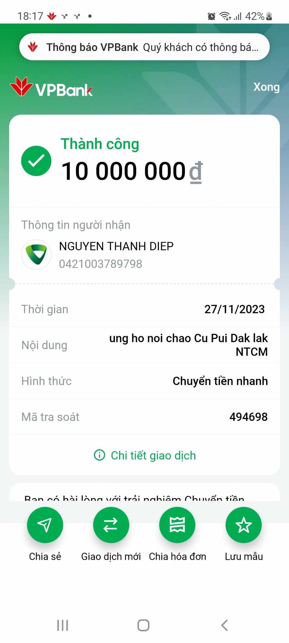 Biết tới tình trạng thiếu hụt kinh phí trầm trọng của nồi cháo từ thiện tại Cư Pui cũng như mừng nồi cháo hoạt động được 11 năm một thành viên của Quán cơm 2000₫ tiếp tục ủng hộ cho nồi cháo 10,000,000₫.