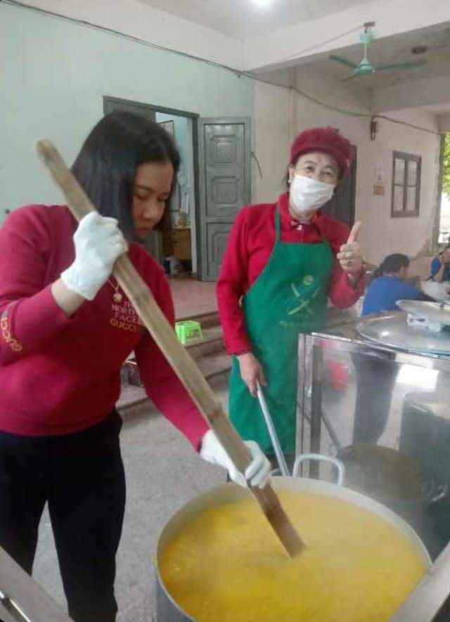 Hai cô tấm Duong Le và Hiền Bùi cùng 6 bạn SV Phân hiệu ĐHY đã hoàn thành công việc hơn cả mong đợi. Cháo ngon, sánh, dẻo thơm và không bị dính nồi… Bệnh nhân lấy cháo xếp hàng quy củ, những ai không mang theo hộp đựng sẽ có các cốc giấy được MTQ tài trợ lâu nay.