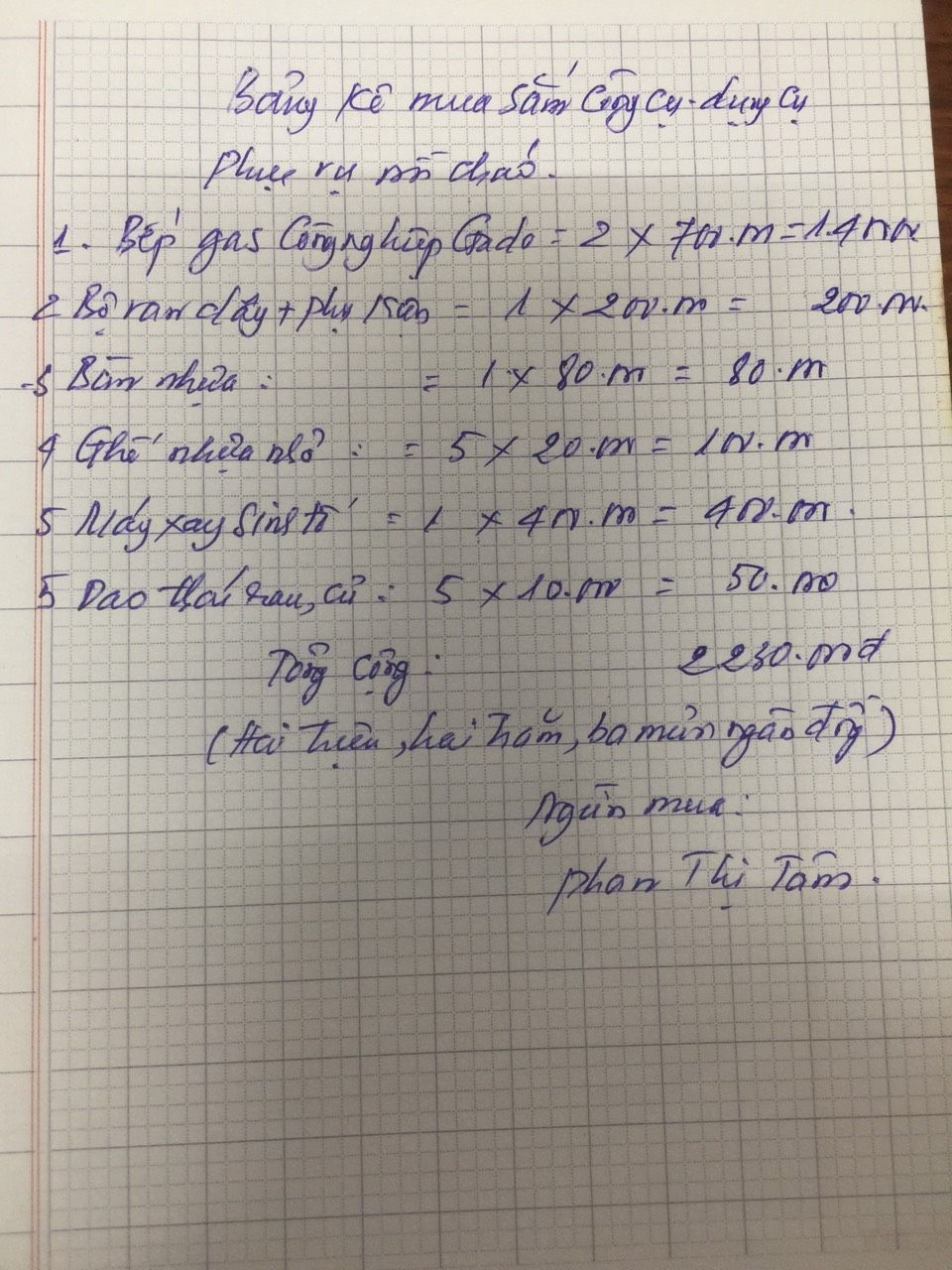 Gửi Ban quản trị diễn đàn.Sau một thời gian sử dụng, công cụ, dụng cụ dùng cho nồi cháo đã xuống cấp và hư hỏng. Để đảm bảo an toàn trong hoạt động cho công việc. Nay nhóm Hà Tĩnh đề xuất thay mới các vật dụng sau:- Bếp gas công nghiệp Gado -GD6E: 2cái x 700,000 = 1.400.000- Bộ van dây, phụ kiện = 1 x 200.000 = 200.000- Bàn nhựa nhỡ = 1 x 80.000 = 80.000- Ghế nhựa nhỏ = 5 x 20.000 = 100.000- Máy xay sinh tố Inter National = 1 x400.000 = 400.000- Dao thái rau,củ = 5 x 10.000 = 50.000- Tổng cộng: 2,230,000 đ (Hai triệu, hai trăm, ba mươi ngàn đồng).Mong ban quản trị xét duyệt.