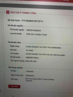 Tiền CMTX xin CHUYỂN VÀO TÀI KHOẢN của Dì ruột cháu là:     ĐỖ THỊ THÚY      2900205290200.    NH: nông nghiệp và phát triển nông thôn. Chi nhánh Hà Nam
