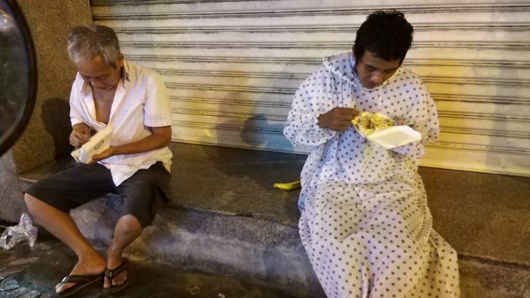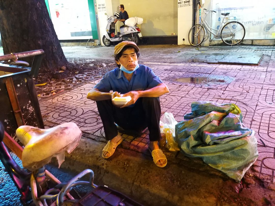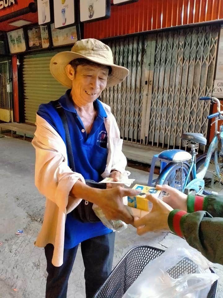 Đứng từ xa xa DucTai thấy anh đang ăn vội một ổ bánh mì của một MTQ nào đó cho nhưng thầm nghĩ bụng với sức của a thì một ổ bánh mì đó cũng chỉ đủ cầm chân cái đói, chống chọi lại cái lạnh tái tê của những ngày mưa nên DucTai đã tiến lại gần, ân cần hỏi thăm và gửi một hộp xôi do các bạn trẻ của nhóm từ thiện NTCM chuẩn bị từ 5h30 chiều, đến khoảng 8h00 tối, ngày 19/09/2020.