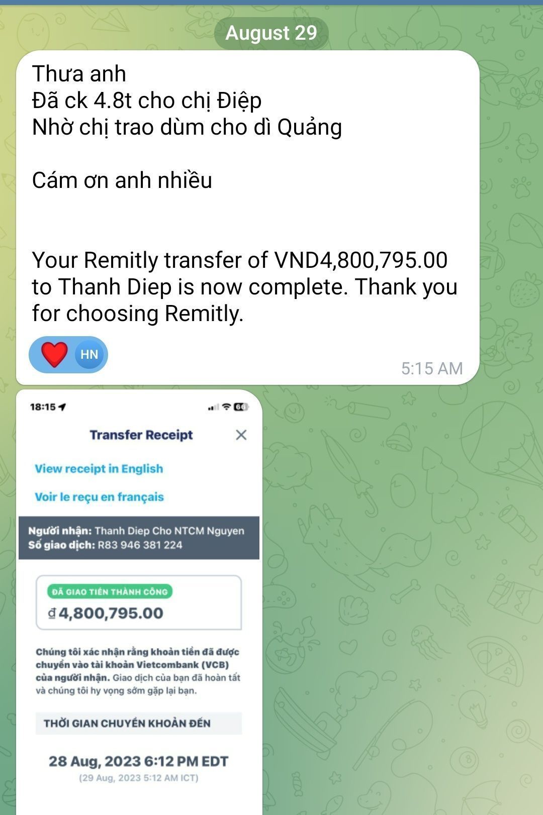 Comay đã chuyển tiền CMTX tháng 8 và 9 với số tiền là 1.600.000đ từ Lacquan và chị Yến đến gia đình dì Quảng. Dì gửi lời cám ơn đến mọi người đã giúp đỡ gia đình suốt thời gian qua.
