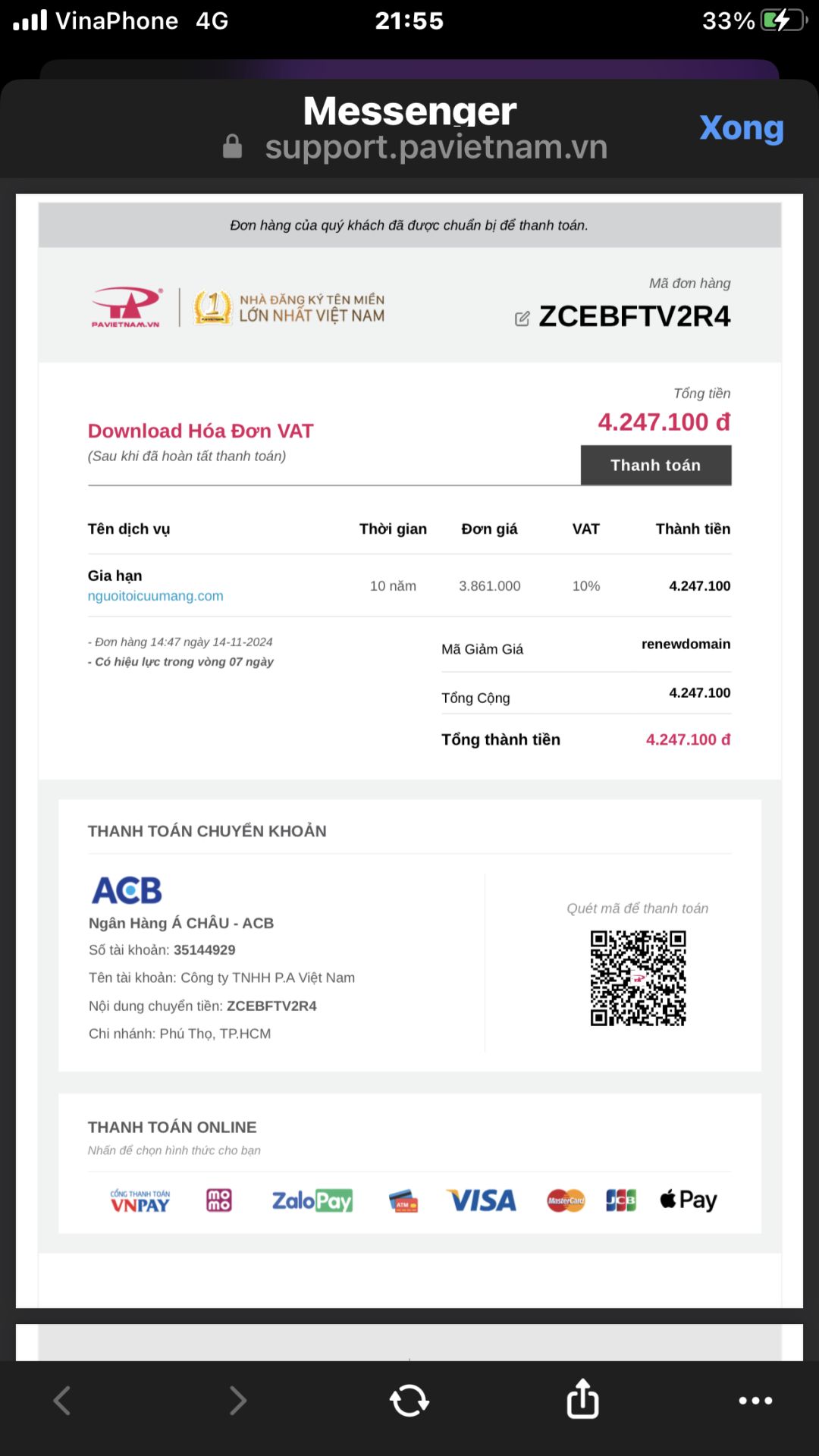 Như trao đổi với anh thì số tiền anh Phuclehuu cập nhật lại tối qua là còn 4.247.100đ (không phải là 4.300.000đ) nên em đã chuyển khoản thanh toán số tiền này nhé.
