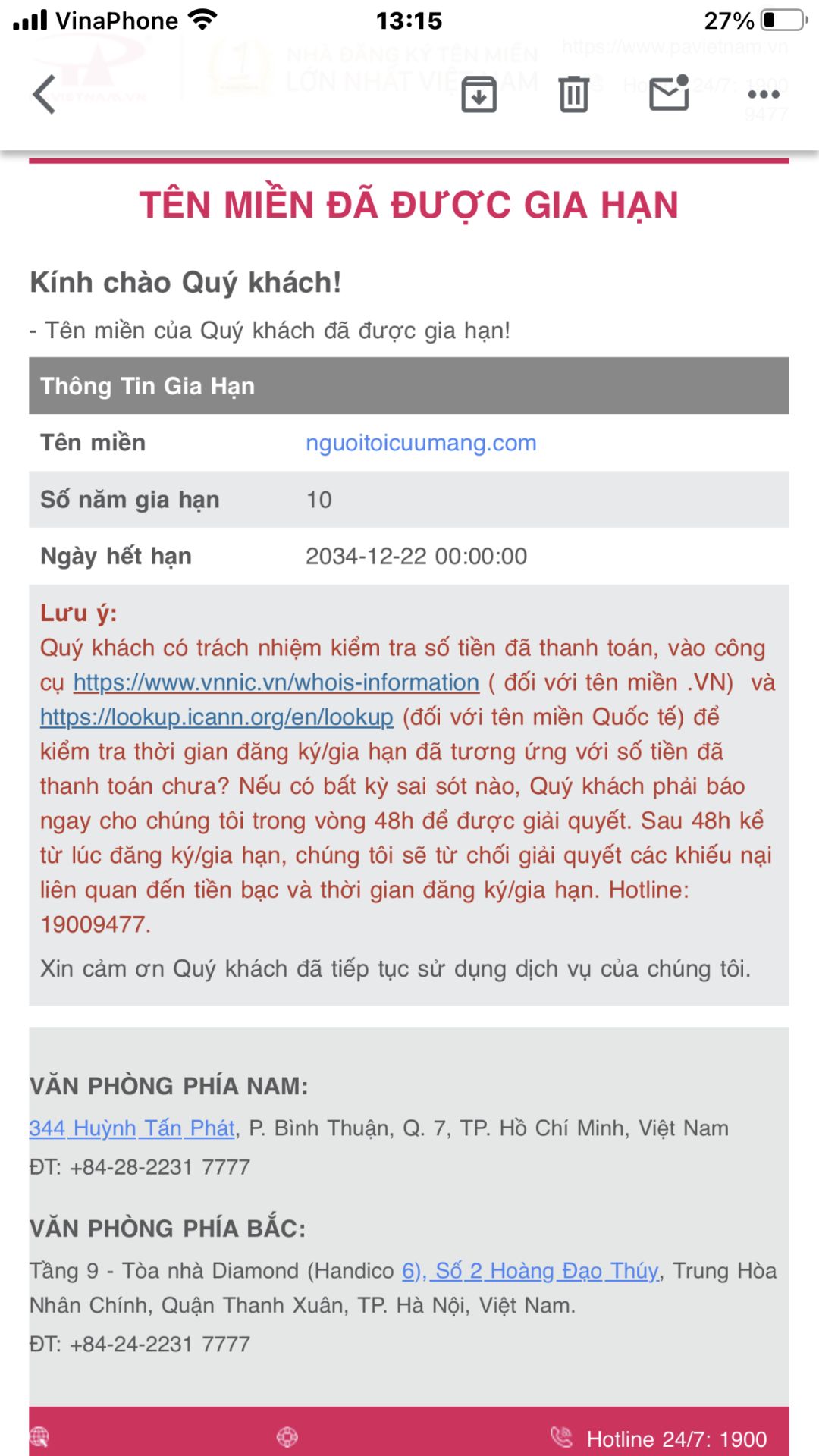 @trangvitgioi : Em xuất quỹ NTCM chuyển cho PA VN 4,300,000₫ để đóng phí duy trì quyền sở hữu tên miền trong 19 năm tiếp theo dùm nhé.