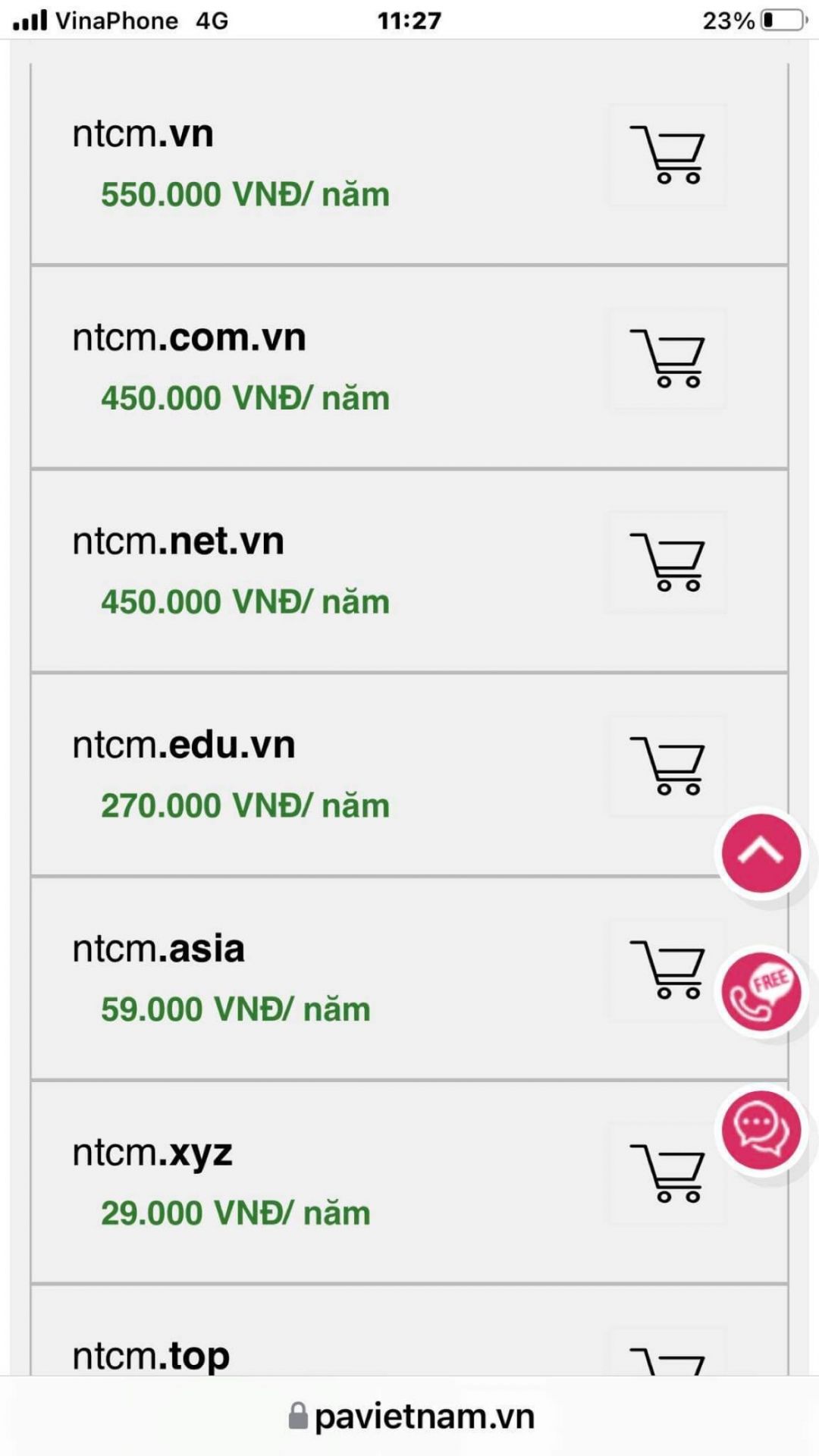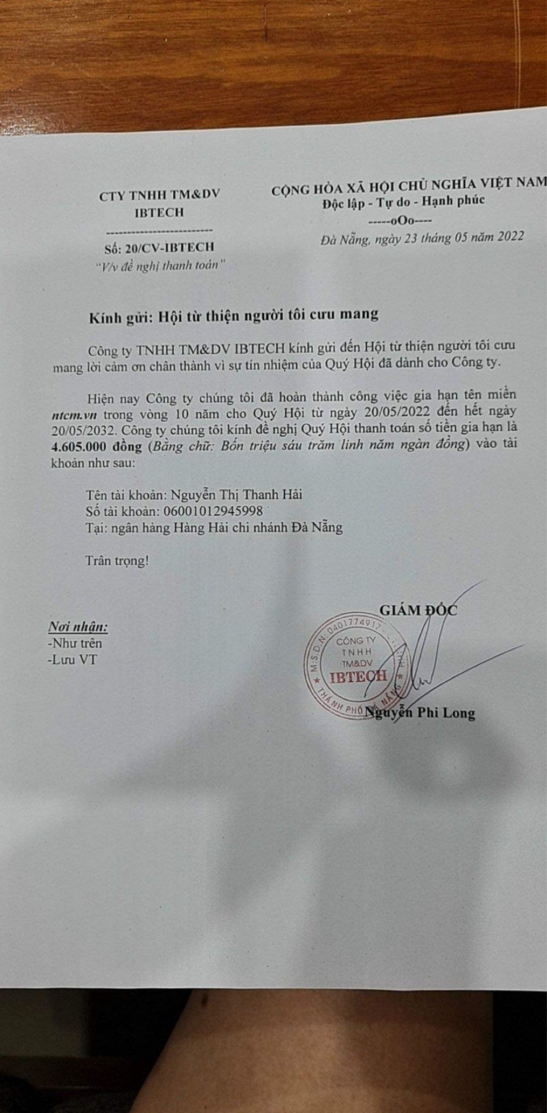 PLH đã làm việc với đại lý tên miền Việt Nam tại Đà Nẵng - Cty IBeTech - để mua quyền tên miền ntcm.vn 10 năm, chúng ta được giảm giá còn 4.605.000đ - Giảm so với giá công bố của nhà cung cấp PAVN 5.500.000đ/10năm (ảnh).