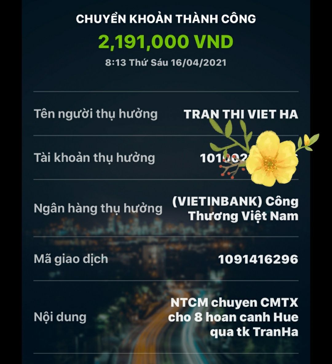 Thocon đã chuyển tới Tran Ha khoản tiền CMTX tháng 4/2021 của các hoàn cảnh sau :