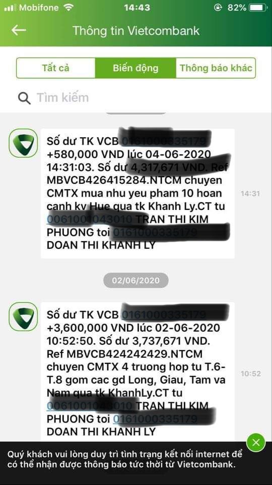 Nhóm NTCM _ HUẾ, sáng nay đã nhận được chuyển khoản số tiền cưu mang các gia đình theo đề xuất. Nhóm sẻ cập nhật hình ảnh và báo cáo đầy đủ khi đi trao đến các gia đình.