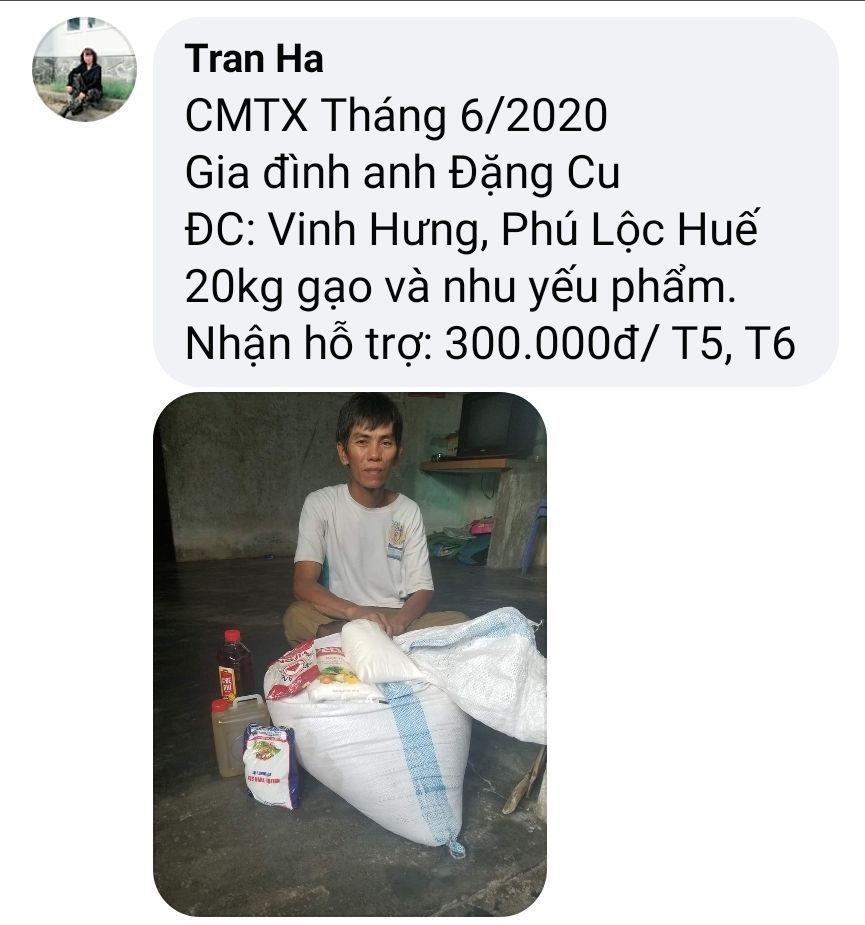 Qua các bài đề xuất cưu mang hàng tháng, thay mặt nhóm NTCM _ Huế em xin nhận trung chuyển lương thực và nhu yếu phẩm đến với các hộ đề xuất. Và số tiền cưu mang xin được chuyển về tài khoản thành viên Khanh Ly.