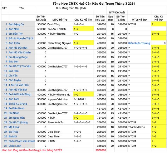 Theo dự tính sơ lược, tổng số tiền cần kêu gọi cho tháng 3/2021 cho các hoàn cảnh CMTX Huế là 9.570.000đ (xem cụ thể trong hình đính kèm).  Đây chỉ là con số sơ bộ, ức lượng.  Con số này không lớn nhưng cũng không phải là nhỏ và cũng là một gánh nặng không nhỏ cho NTCM nếu chúng ta phải xuất quỹ do chưa tìm được MTQ hữu duyên.  Mong cả nhà bỏ chút thời gian kết nối những hoàn cảnh cần giúp đỡ này đến với MTQ qua những phương tiện truyền thông xã hội hoặc trực tiếp đến với bạn bè, thân quyến gần xa.
