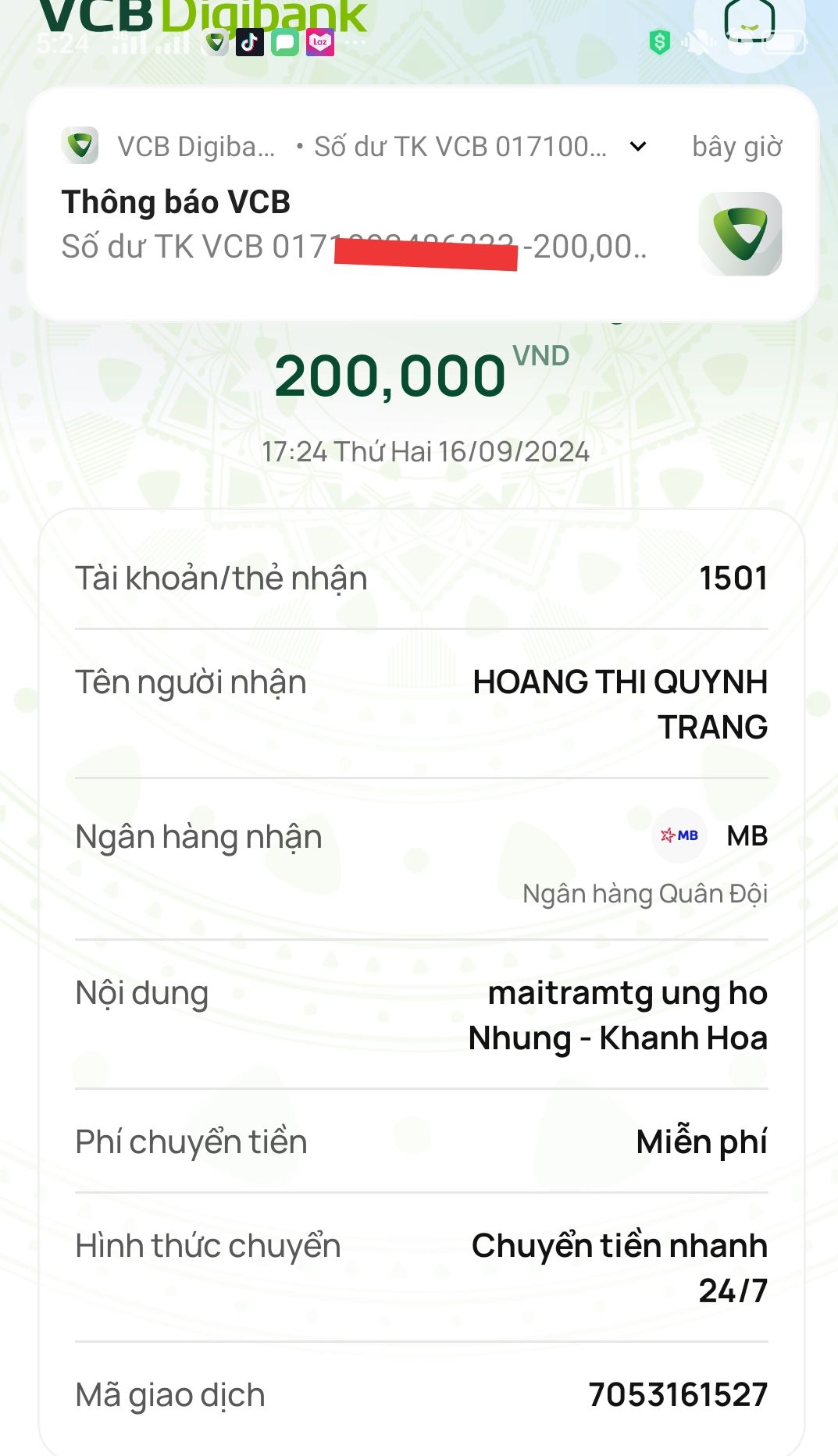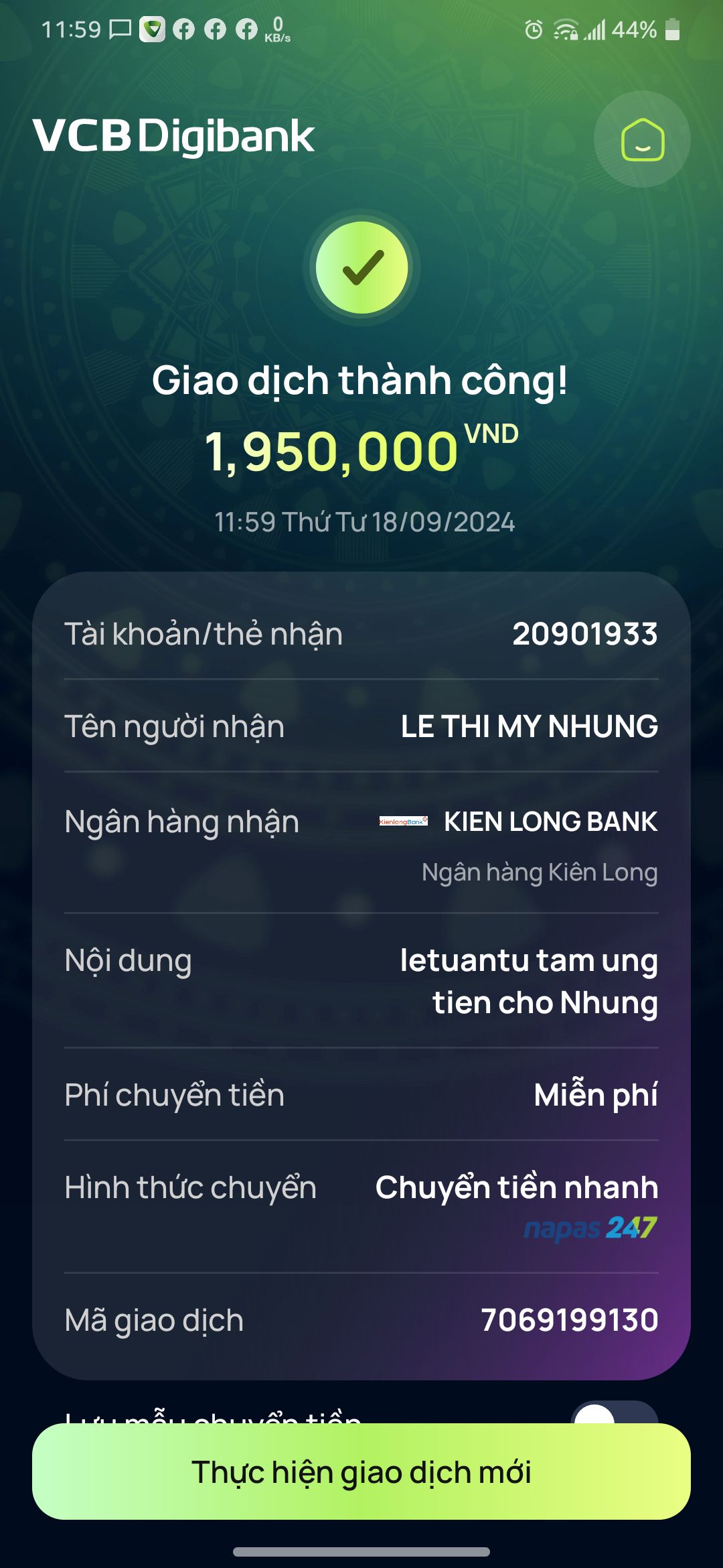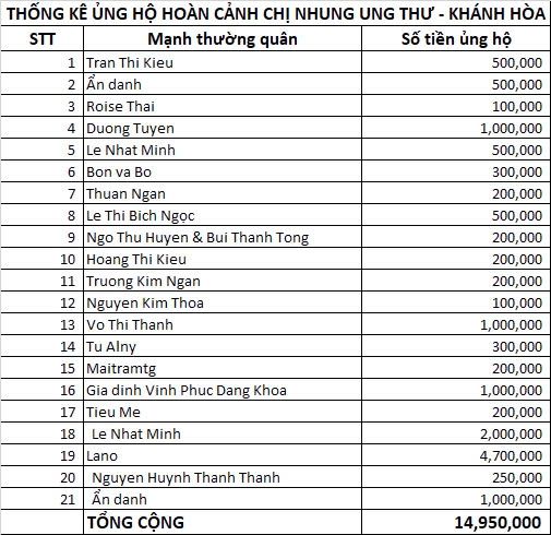 Tính đến thời điểm hiện tại, số tiền ủng hộ kêu gọi qua NTCM hỗ trợ cho Nhung đã được 14,950,000đ.