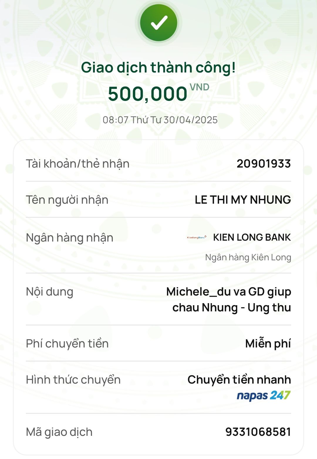 Michele_du và Gia đình gửi thêm 500,000₫ để giúp cháu Nhung được chăm sóc y tế đầy đủ hơn trong những tháng ngày cuối của cuộc đời.