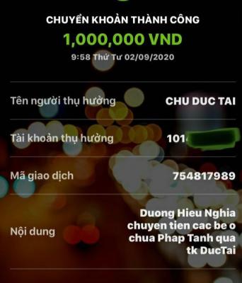 DucTai sẽ đảm nhiệm việc trung chuyển số tiền bạn Trung Ngân đã CMKTX T01 cho chùa Pháp Tánh!