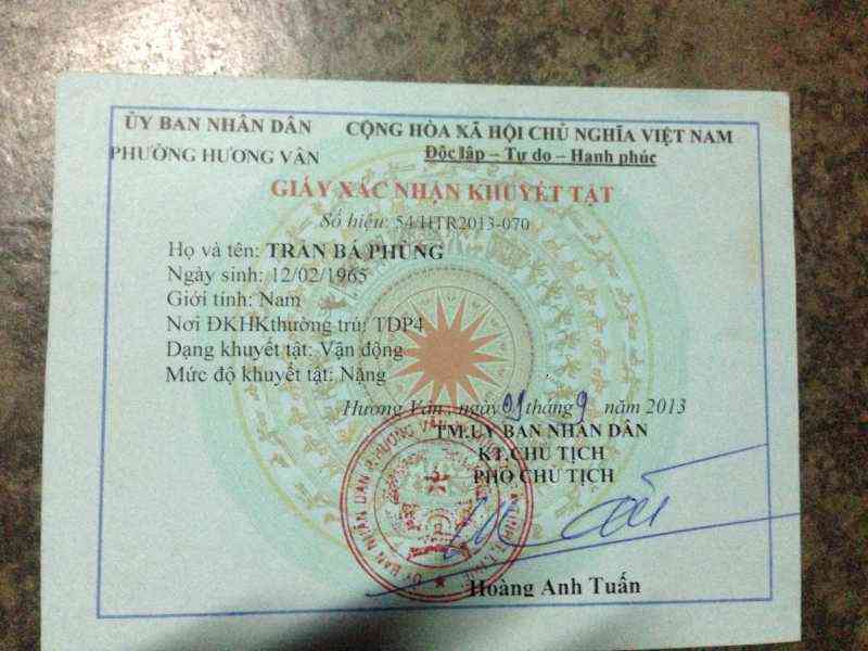 Chú Phùng (51 tuổi) khi khoẻ mạnh chú làm rừng sau khi xảy ra tai nạn lao động chú bị chứng thương cột sống do không có tiền để chuyển ra Hà nội để mổ nên bệnh tình chuyển biến xấu. Hiện tại hai chân của chú bị teo cơ, đi lại khó khăn, cộng thêm căn bệnh dò hậu môn, đến lúc trái gió trở trời chú phải nhờ đến thuốc giảm đau. Chú được chính sách hổ trợ 405.000 / tháng.
