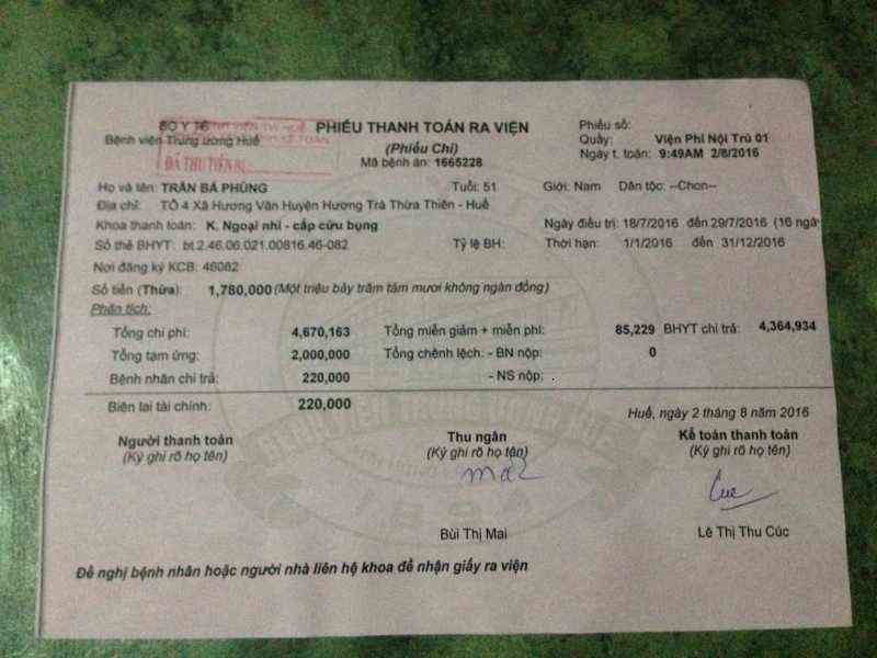 Do gia đình thuộc hộ nghèo và bảo hiểm người tàn tật nên viện phí bảo hiểm chi trả 95%. Còn chú chịu 5%.