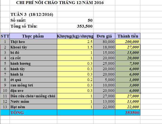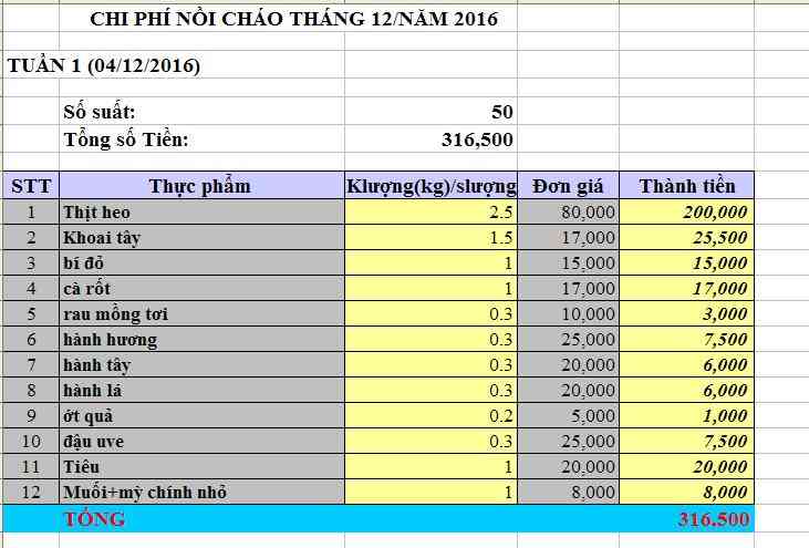 Dragonfly cập nhật chi phí tiền đi chợ nồi cháo Quảng Trị tháng 12/2016
