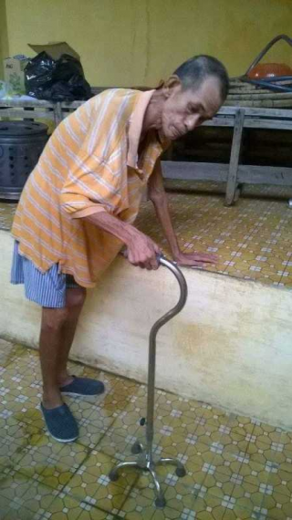 Chú Ban vịn gậy để tập đi lại