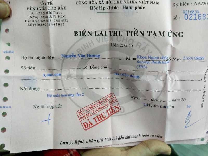 Tiền viện phí những ngày qua là 1.568.970 đồng, tiền thuê xe chở anh về là 1.300.000 đồng. Qua trao đổi với chú 6x thì letuantu đã ứng tiền đóng viện phí và tiền xe tổng cộng là 3.000.000 đồng để giúp gia đình chuyển anh về quê.