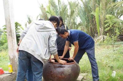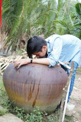 Hình ảnh các anh đang chà rửa cái lu nước dùm Chú.