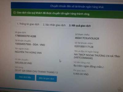 Lathuvang đã chuyển TK Vankieusa 900,000đ CMTX T1,2,3/2018 Anh Thành của Canthoquetoi. Nhờ Vân chuyển tiếp dùm nhé. Cảm ơn nhiều.