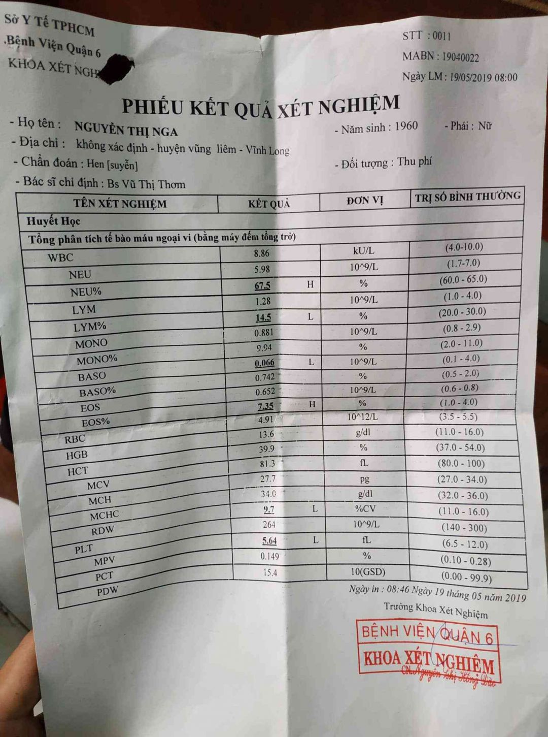 Giấy xét nghiệm ở BV quận 6
