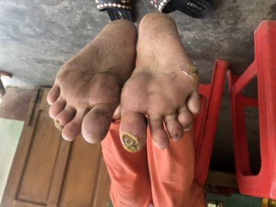 Tình hình sức khoẻ chị Lương ngày một yếu, các ngón chân bắt đầu có hiện tượng hoại tử, tay chân xơ cứng kg cử động được, mặt sưng lớn