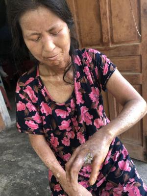 Chị lại mới từ bệnh viện hà nội về, các đầu ngón tay của chị bắt đầu hoại tử nặng, hiện tại đã phải tháo khớp ngón thứ 2 áp út tay phải