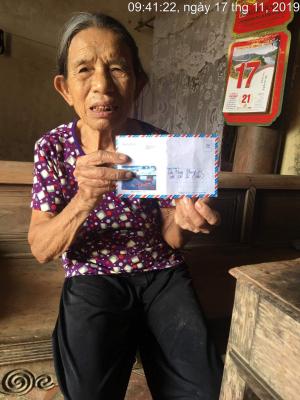 Tụi con đã trao xong 3 tháng T10-12 cho hoàn cảnh của cụ. Kính mong các MTQ tiếp tục đồng hành cưu mang 3 tháng tiếp theo  từ T1-T3/2020  cho gđ cụ số tiền 1.500.000đ/tháng. Cám ơn cả nhà