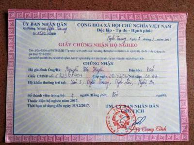 - [13/10/2017]:ÔNG NGUYỄN PHÚ DŨNG Địa chỉ: xóm 5 Nghi Trung Nghi Lộc Vợ: Nguyễn Thị Ngọ, bệnh tật Con: Nguyễn Thị Huyền, thị giác yếu, lao động chính Nguyễn Thị Duyên, bại liệt, hở van tim Cháu: Đạt (2001), Hưng (2006) Nhà 7 người mỗi chị Huyền có khả năng lao động, hoàn cảnh khó khăn[caoxuanhuu]