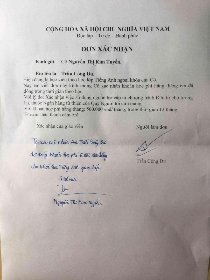 Cháu xin gởi cả nhà giấy xác nhận cho khoản học phí Tiếng Anh ngoại khoá Cháu đã theo học ạ