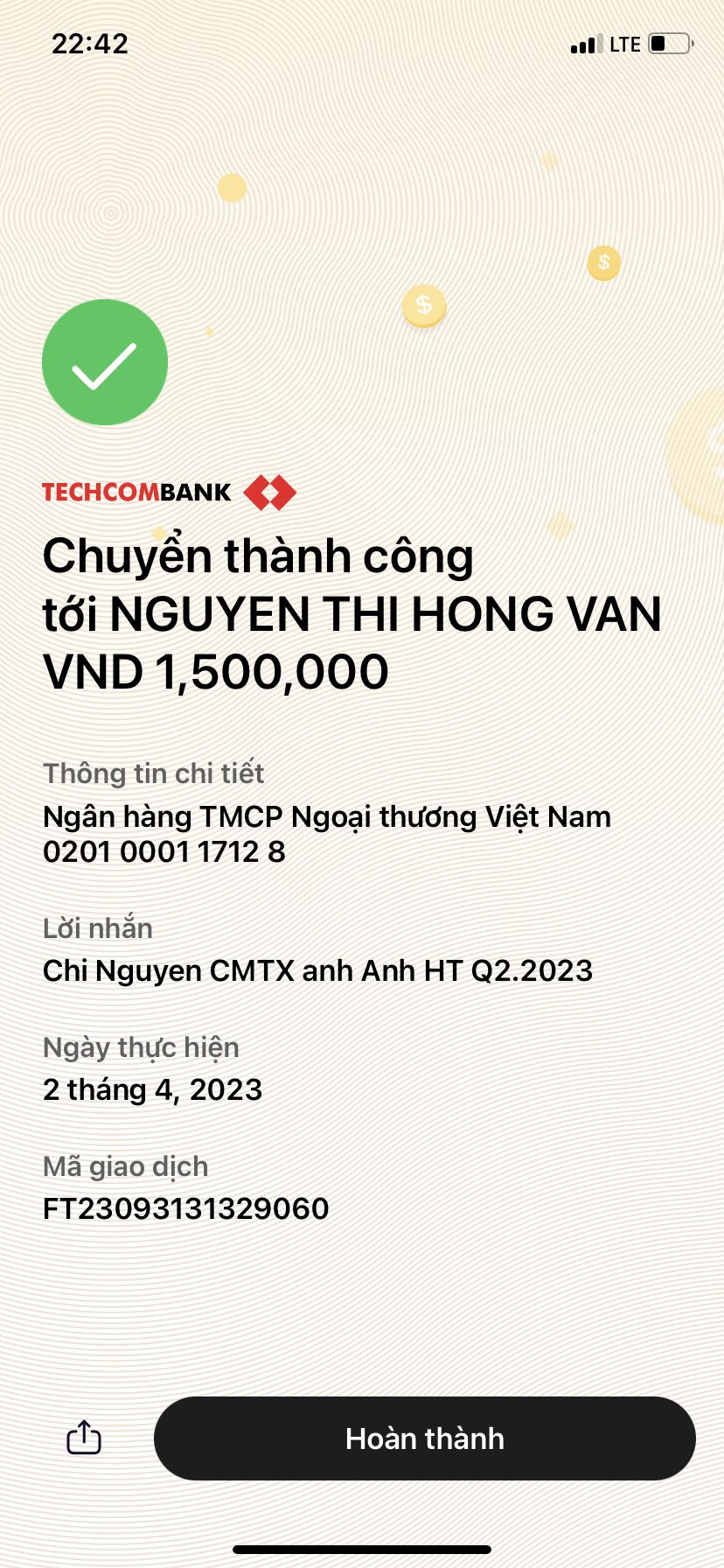 Được biết gần đây Thuỳ Linh Võ nhận chuyển CMTX tới anh Ánh nên khoản CMTX từ Chi Nguyen sẽ chuyển tới Linh luôn. (1,500,000 VND cho 3 tháng 7-8-9/2023).