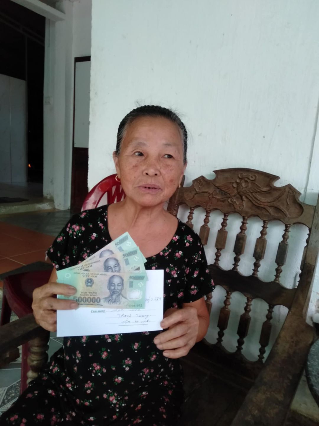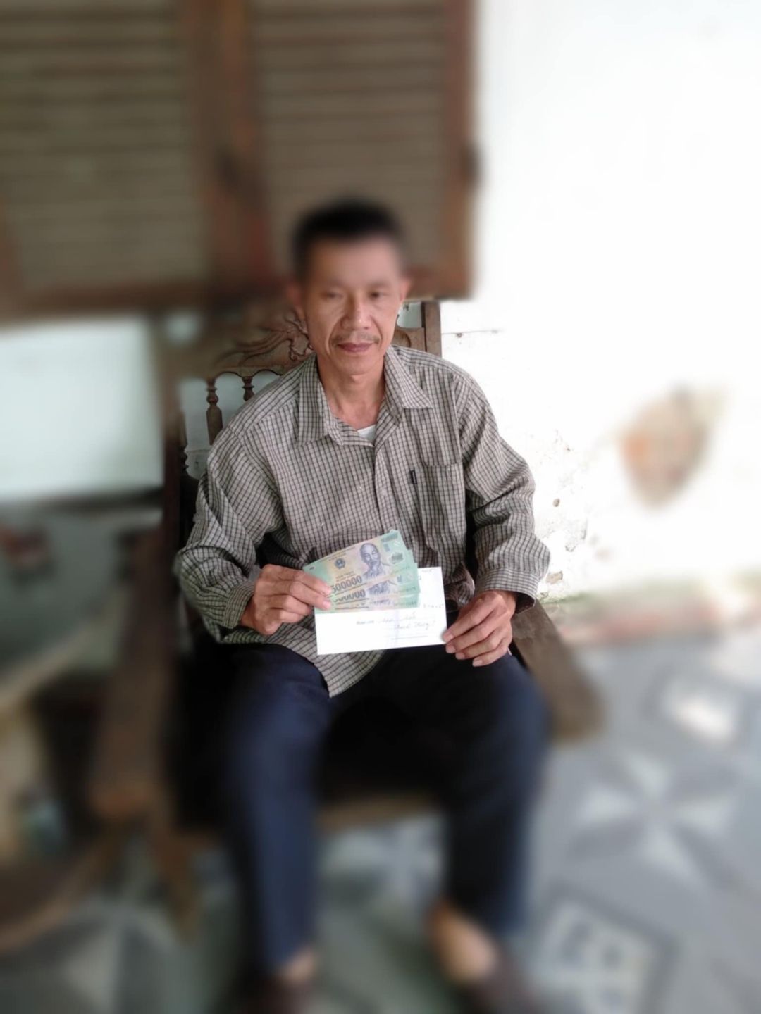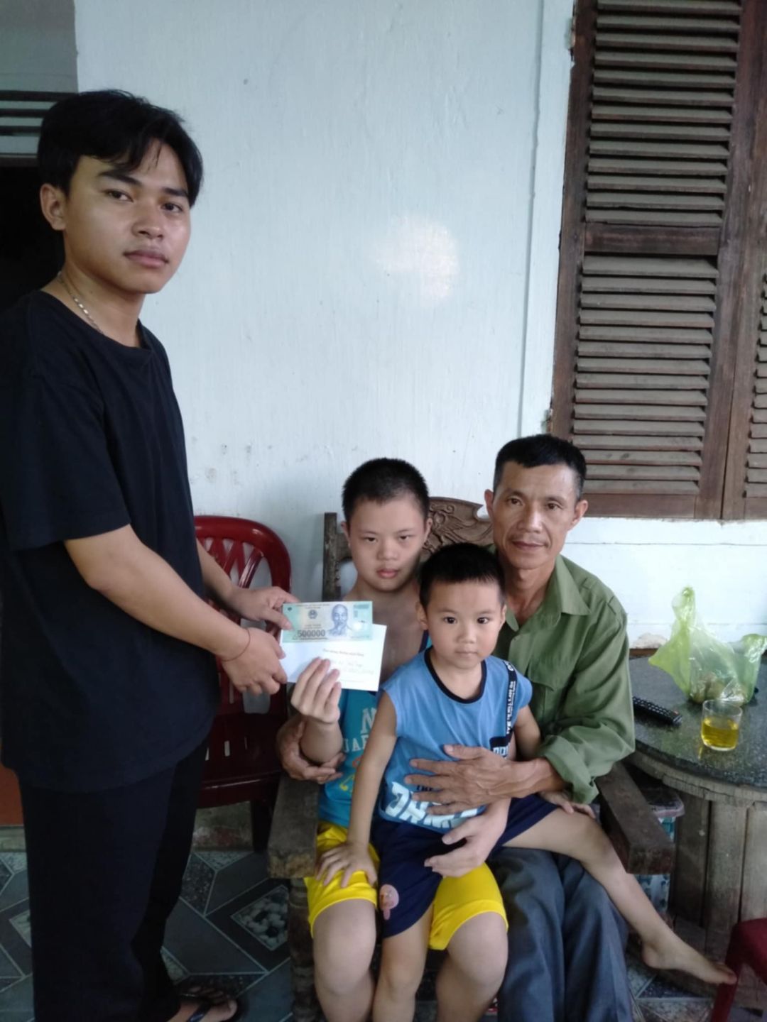 Lần này nhóm xuống thăm và trao cm, anh ấy bị chóng mặt buồn nôn lại phải ra HN để khám, chỉ có mẹ anh ấy ở nhà nhận thay.
