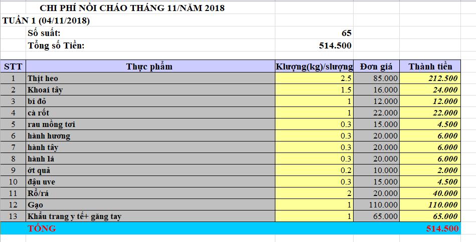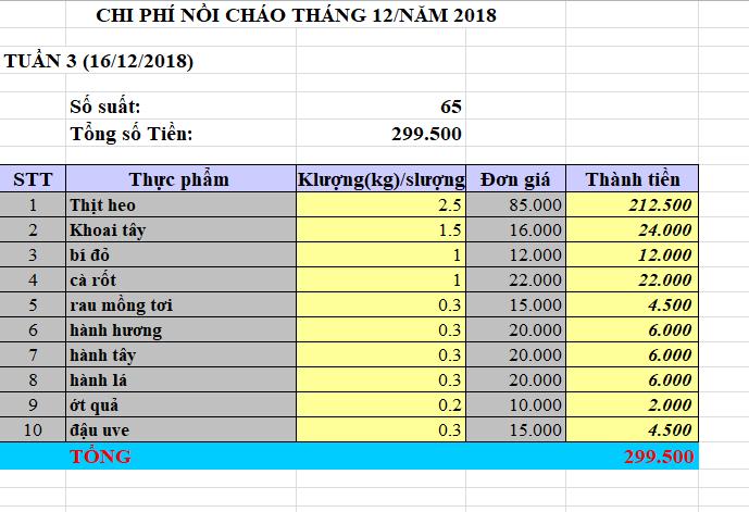chi phí nồi cháo tháng 1/2018
