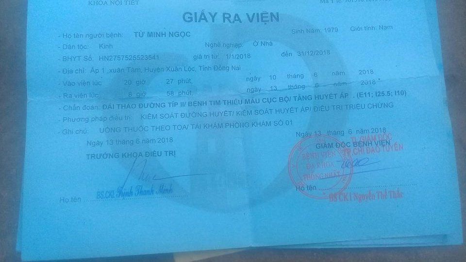 - Người thứ 2 là anh Từ Minh Ngọc bị bệnh , hàng ngày phải đi bệnh viện nên cũng không có việc gì làm . Anh Ngọc có BHYT nên đi khám bệnh cũng được miễn phí vì bảo hiểm hộ nghèo . Nghe anh Ngọc nói giờ chỉ đi khám ở BV huyện thôi vì không có đủ kinh phí đi SG nữa , với lại khi đi ở BV huyện ăn uống hàng ngày cũng nhờ cơm cháo từ thiện . Giấy tờ khám bệnh ở BV Gia Định nghe anh Ngọc nói là không có , lúc gặp em Lethidan và các bạn ở SG hình như cũng không có . Bây giờ chỉ có giấy tờ ra viện ở BV huyện Xuân Lộc mà thôi chứ không có giấy tờ gì khác .