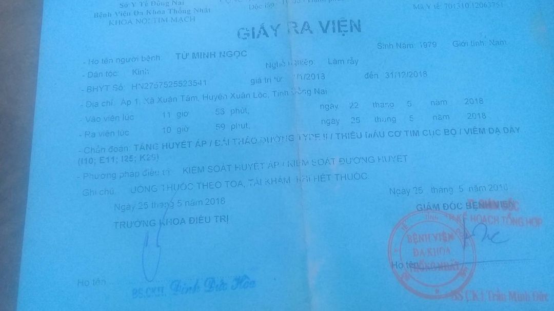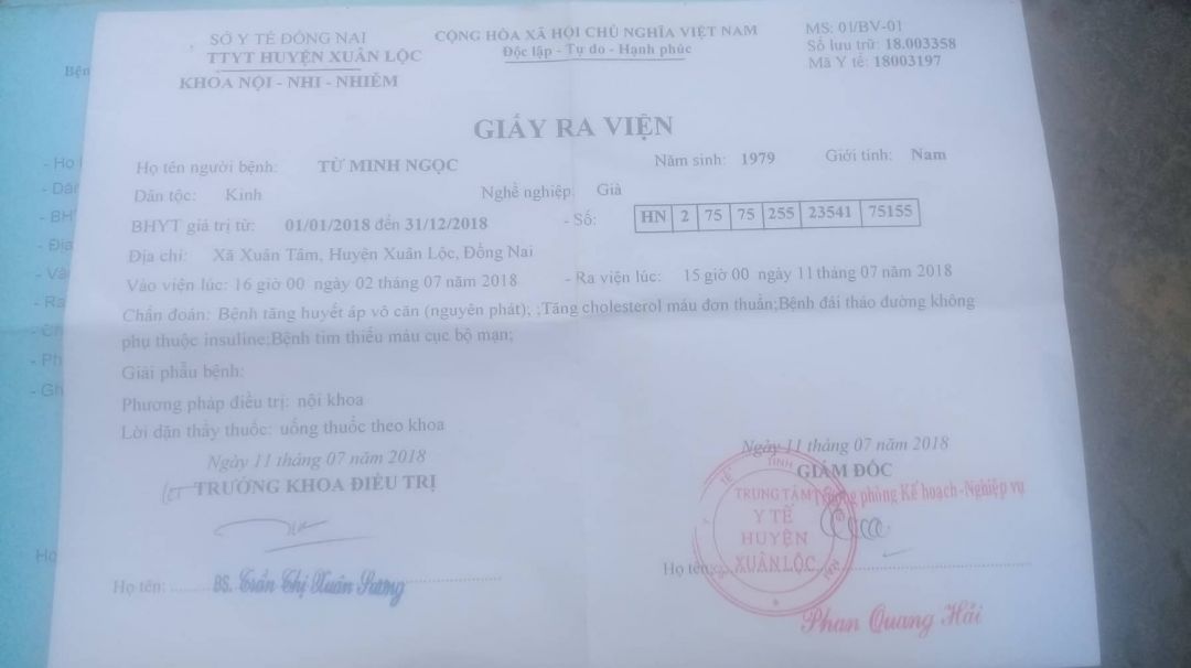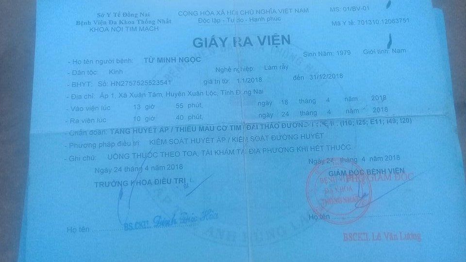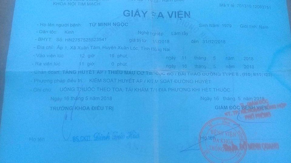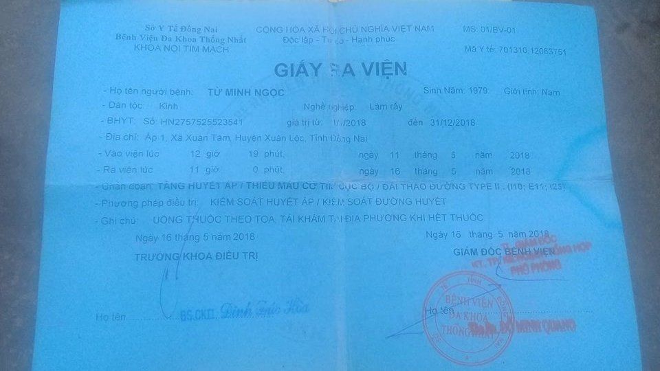 - Người thứ 2 là anh Từ Minh Ngọc bị bệnh , hàng ngày phải đi bệnh viện nên cũng không có việc gì làm . Anh Ngọc có BHYT nên đi khám bệnh cũng được miễn phí vì bảo hiểm hộ nghèo . Nghe anh Ngọc nói giờ chỉ đi khám ở BV huyện thôi vì không có đủ kinh phí đi SG nữa , với lại khi đi ở BV huyện ăn uống hàng ngày cũng nhờ cơm cháo từ thiện . Giấy tờ khám bệnh ở BV Gia Định nghe anh Ngọc nói là không có , lúc gặp em Lethidan và các bạn ở SG hình như cũng không có . Bây giờ chỉ có giấy tờ ra viện ở BV huyện Xuân Lộc mà thôi chứ không có giấy tờ gì khác .