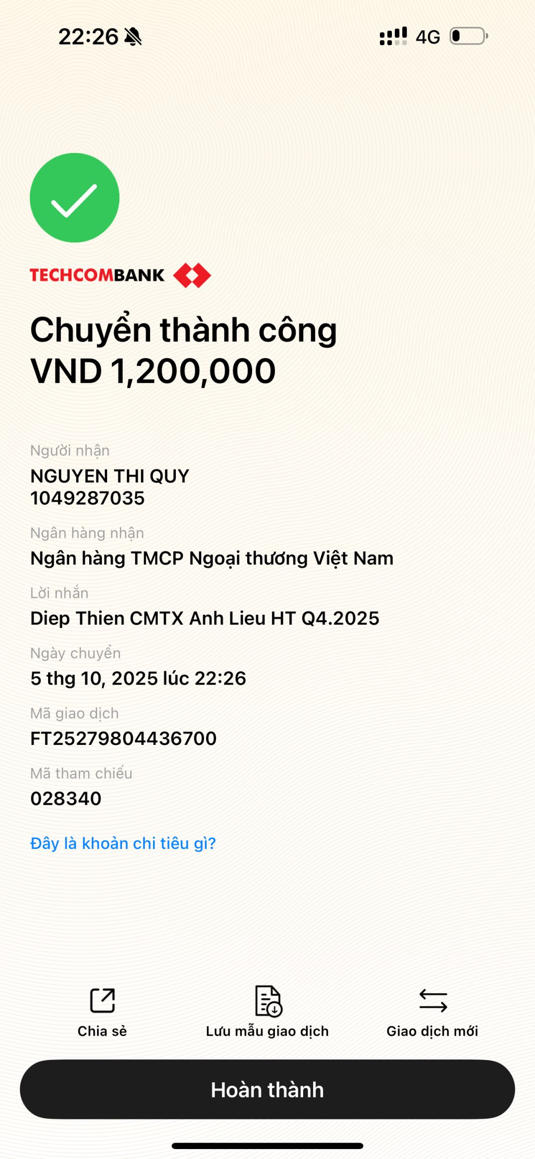 DiepThien xin gửi số tiền CMTX Quý 4/2025 tới anh Liệu. Mong anh bình an.