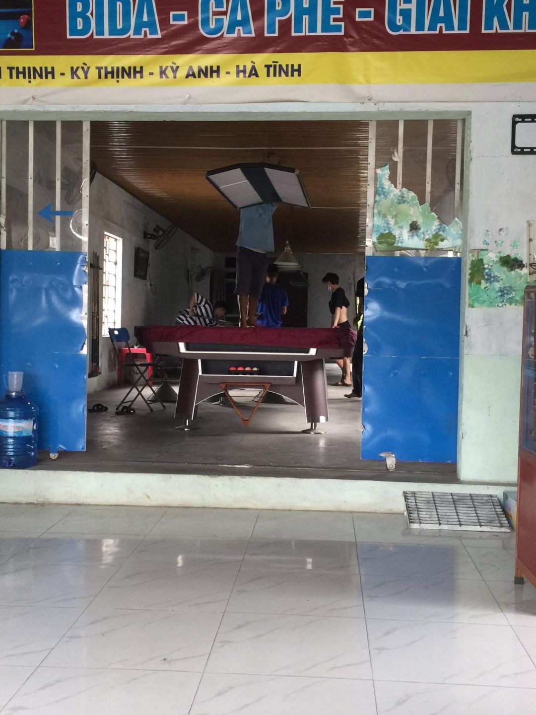 ( Hình ảnh thợ đang lắp đặt bàn mới, và khách đang chơi ở hai bàn còn lại)