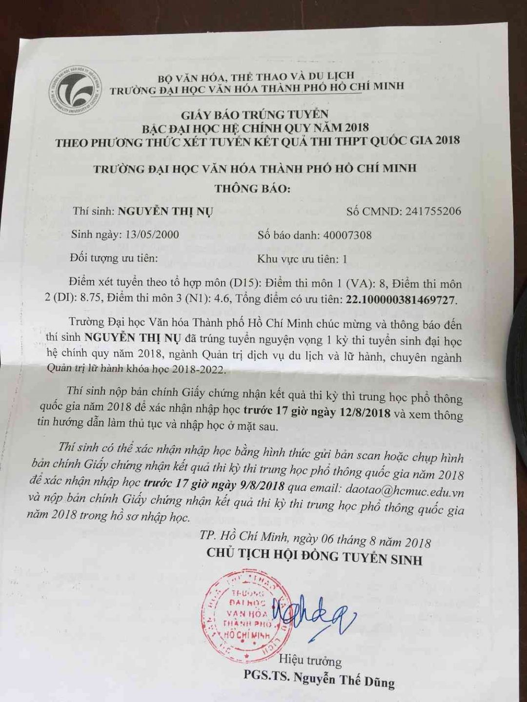 6x đã liên lạc với cháu Nụ qua điện thoại và được biết 20/8/2018 cháu ấy phải có mặt tại trường Đại học Văn hóa TP. HCM và chưa biết có thể ở trọ tại đâu.